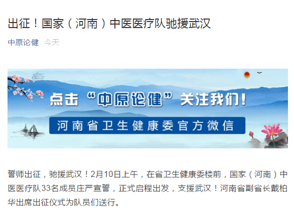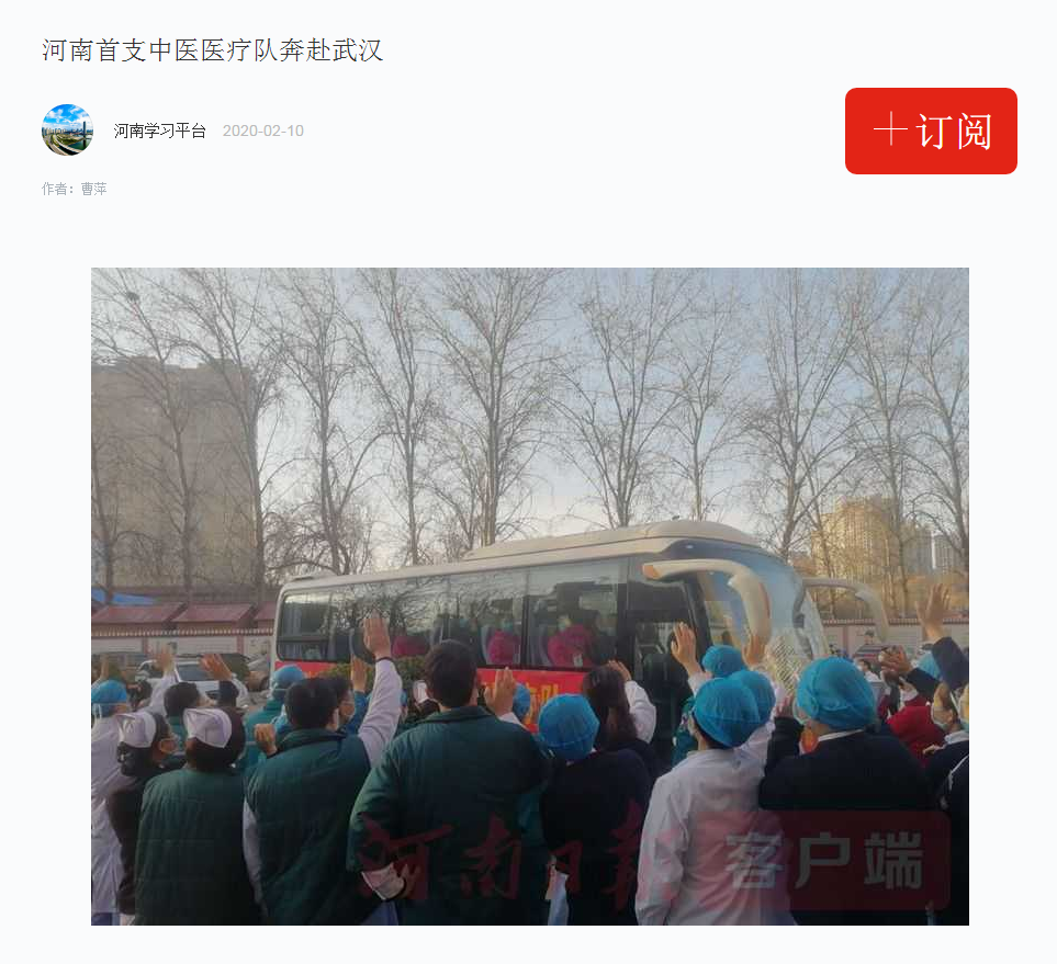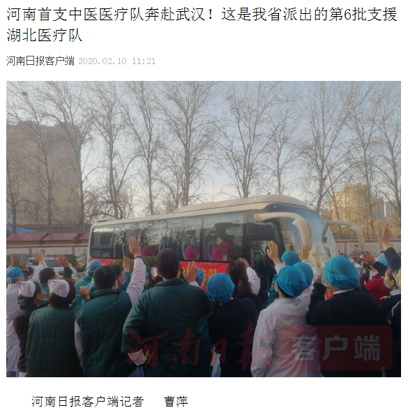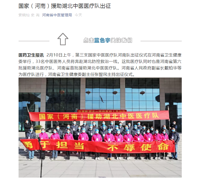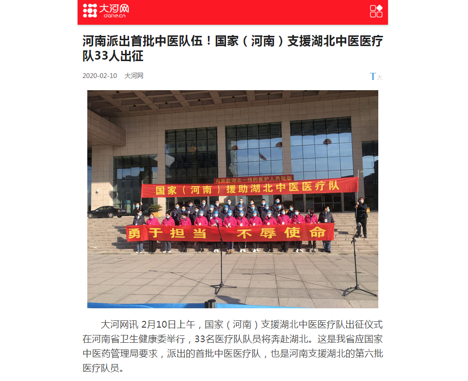 编者按:2020年2月10日,学习强国、央广网、全国党媒信息公开平台、河南日报客户端、河南省中医管理局官微、河南日报报业集团、河南省卫生健康委官方微信、大河网、腾讯网、人民看点新媒体、医药卫生网、河南广播电视台·健康大河南官方微信、河南广播电视台都市频道官方微信、河南广播电视台都市频道官方微信、河南一百度等媒体对leyu·乐鱼(中国)体育官方网站援助武汉国家(河南)中医医疗队启程进行报道。现将河南日报客户端《河南首支中医医疗队奔赴武汉! 这是我省派出的第6批支援湖北医疗队》全文刊发如下:
