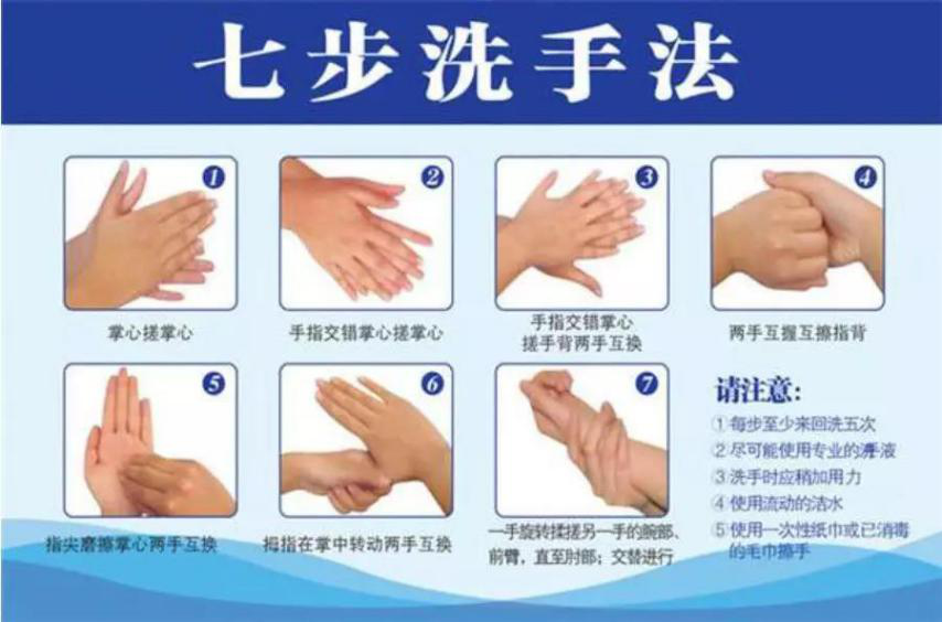 1.勤洗手。餐前、便前便后、接触垃圾、外出归来、使用体育器材、学校电脑等公用物品后、接触动物后、触摸眼睛等“易感”部位之前,接触污染物品之后,双手接触呼吸道分泌物后(如打喷嚏后)立即洗手。建议采用“七步洗手法”,使用肥皂或洗手液并用流动水洗手,用一次性纸巾或干净毛巾擦手。