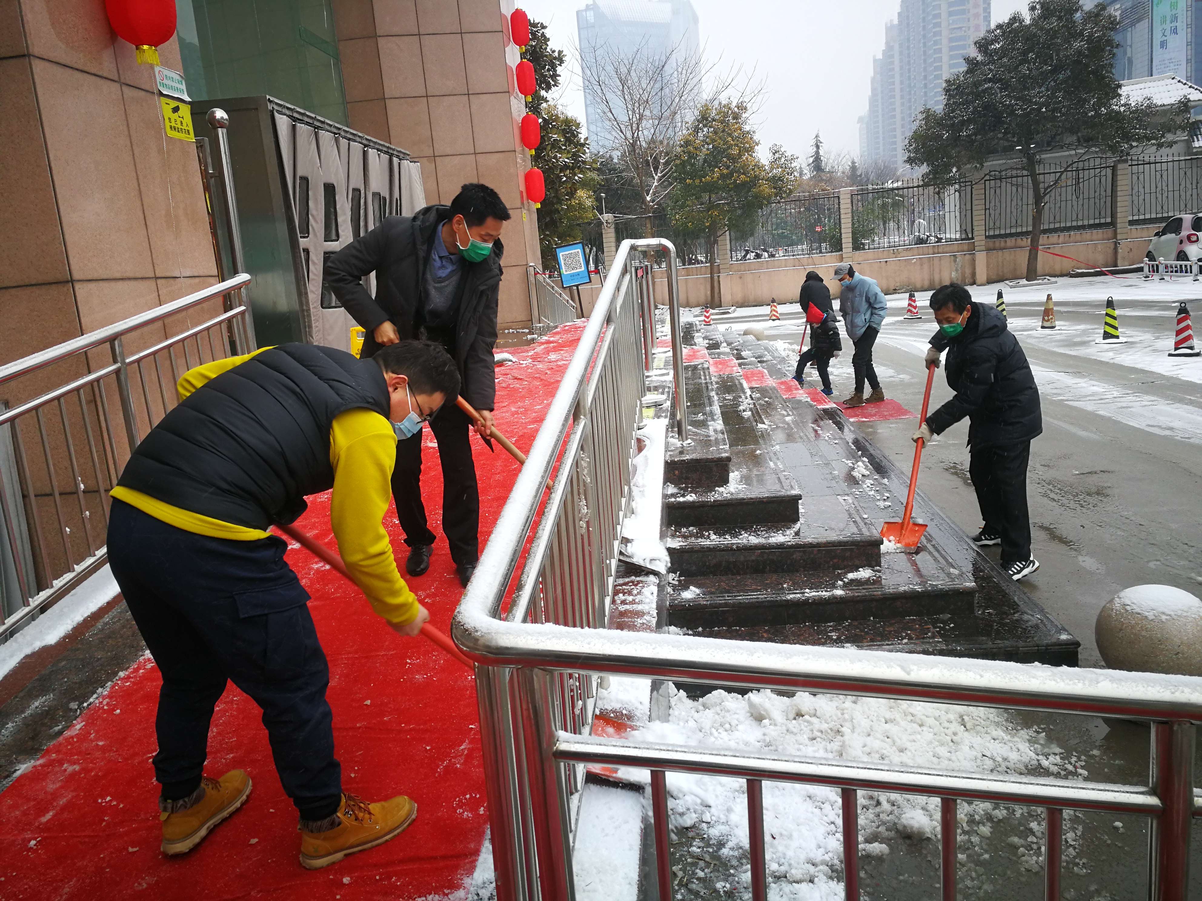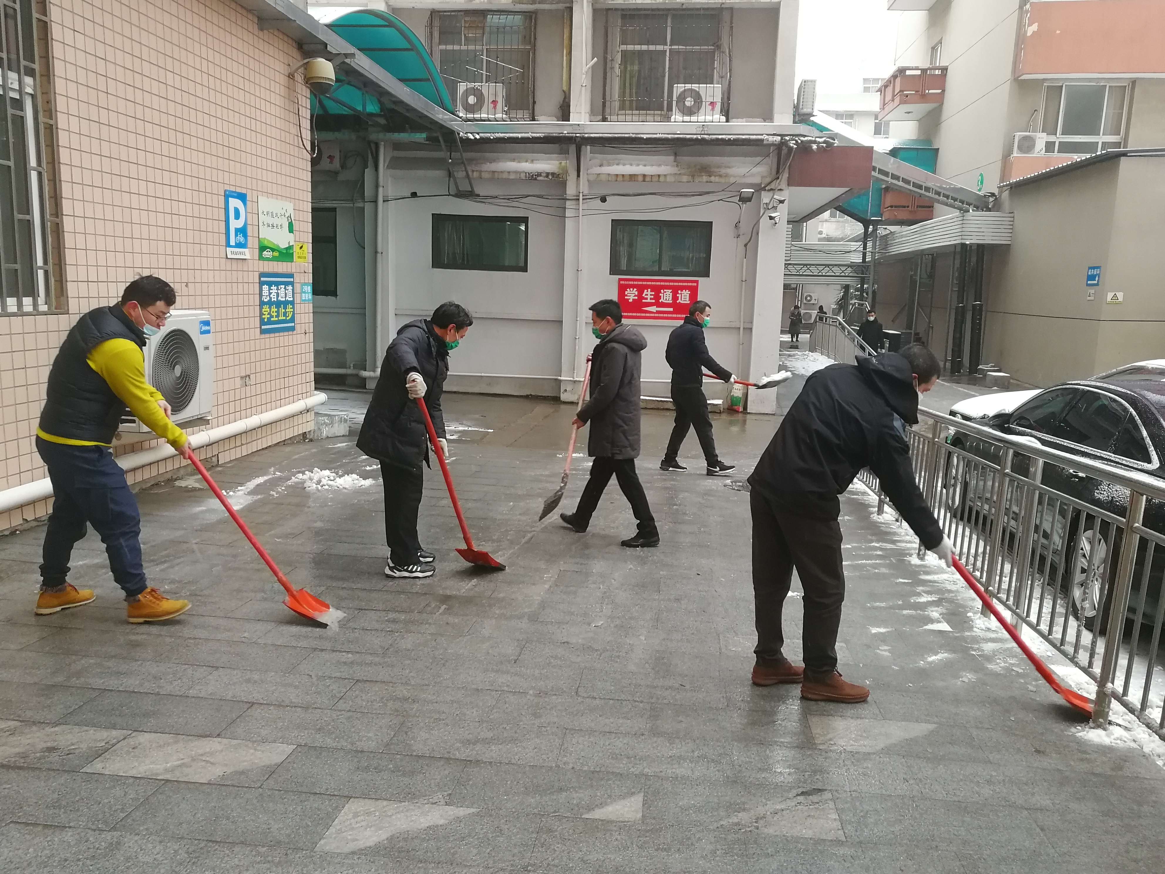 在门诊楼、在住院楼各病区门前,大家冒着寒风、踏着积雪、不畏严寒,纷纷拿起铁锹、扫帚等工具,清扫着路面上的积雪。在凌冽寒风中,广大党员用自己的实际行动展现出了教职工良好精神面貌,让这个冬日变得格外温暖,在满院的红灯笼下衬托下、在皑皑白雪中呈现出一道靓丽的风景。通过大家的努力,很快积雪与结冰的路面打扫完毕,方便了行人及车辆安全出行。