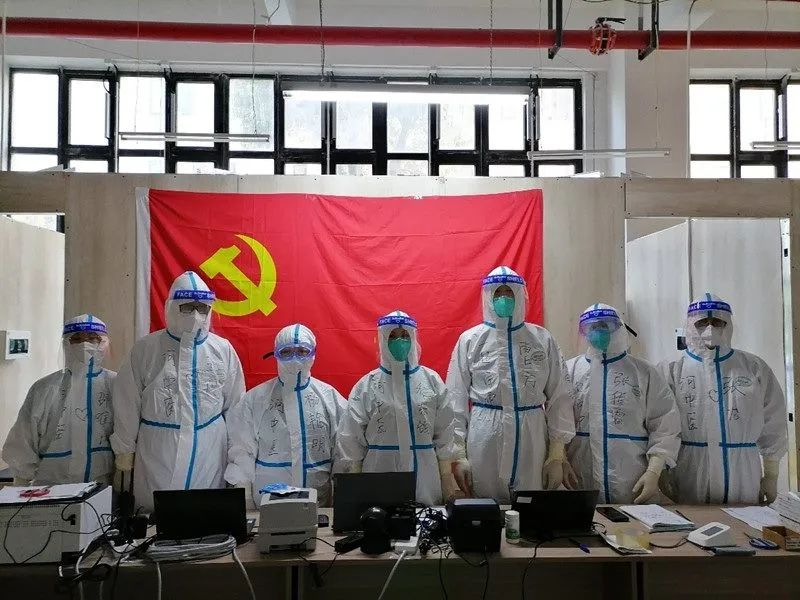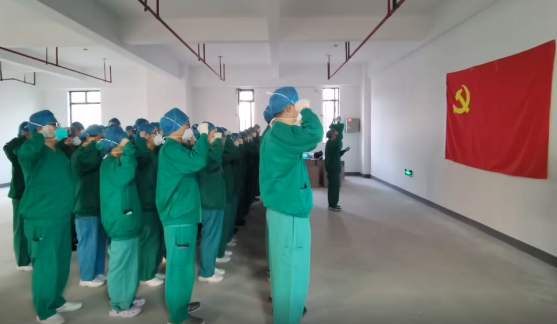 把鲜红党旗竖起来,把党员身份亮出来!为坚定初心使命,医疗队抵达上海后,在抗疫一线火速成立临时党总支和临时党支部,建立有力组织保障。进‘舱’前吹响集结号!援沪医疗队重温入党誓词。50余名党员在领队乔东鸽带领下,面对鲜红的党旗高举右拳,庄严宣誓。
