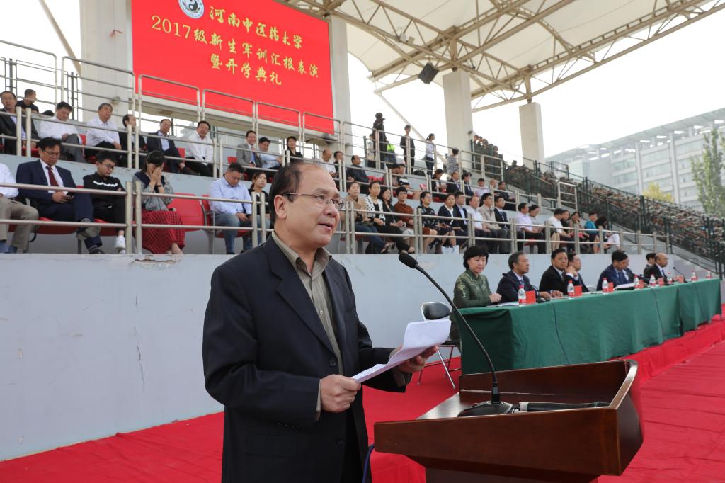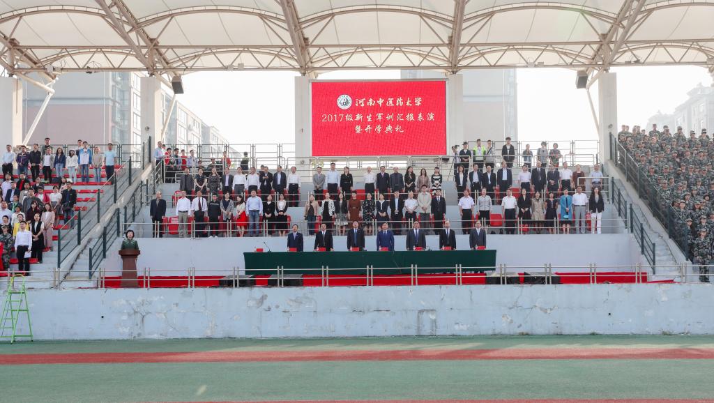 2017年9月28日上午,leyu·乐鱼(中国)体育官方网站2017级新生军训汇报表演暨开学典礼在leyu·乐鱼(中国)体育官方网站东体育场隆重举行。校领导别荣海、许二平、王少玉、张小平、徐江雁、冯卫生、田力、张加民出席典礼,河南陆军某预备役师官兵们,学校各单位、各部门负责人,教师代表,2017级本专科学生、研究生、留学生,高年级学生代表参加活动。典礼由副校长田力主持。