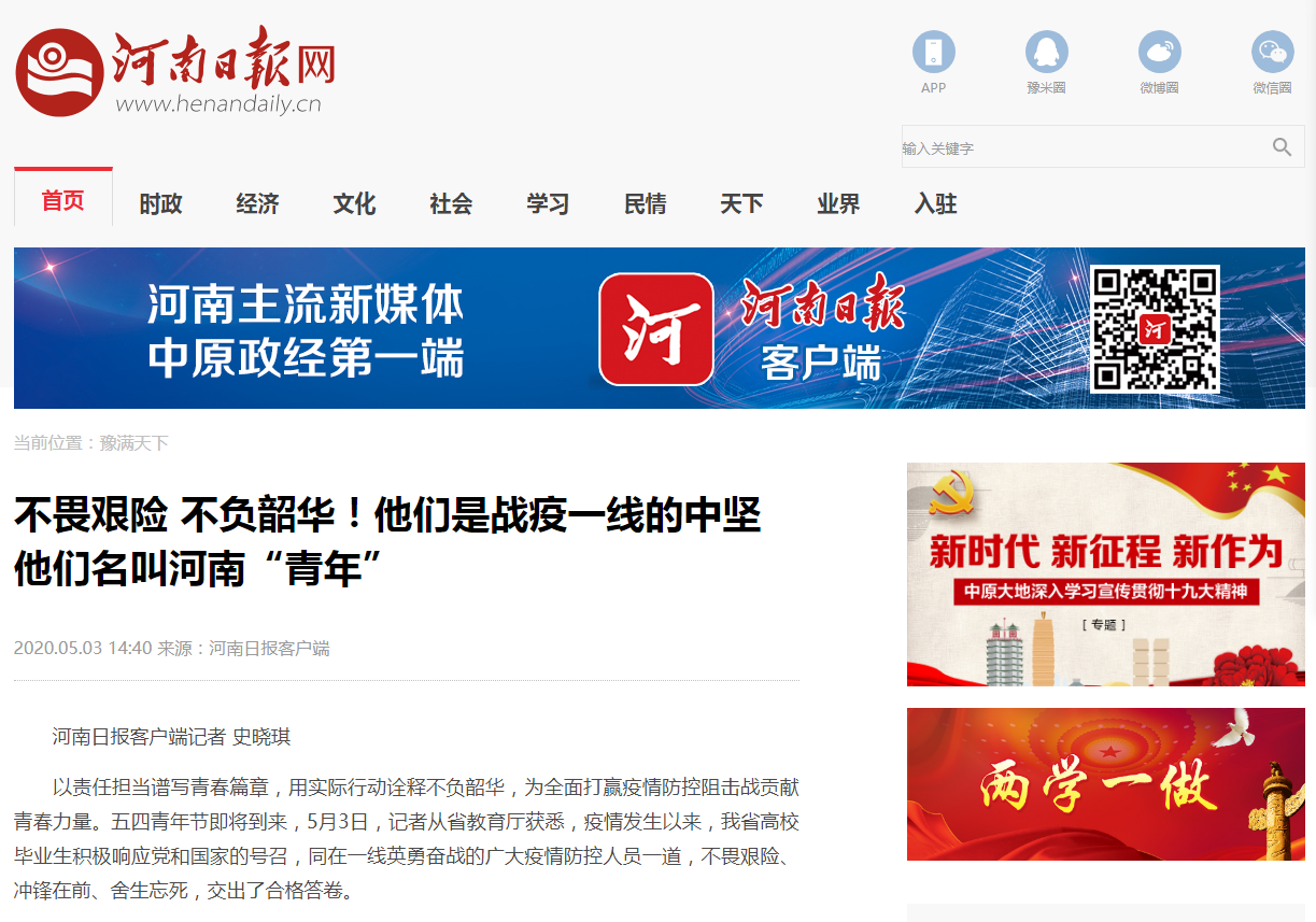 以责任担当谱写青春篇章,用实际行动诠释不负韶华,为全面打赢疫情防控阻击战贡献青春力量。五四青年节即将到来,5月3日,记者从河南省教育厅获悉,疫情发生以来,河南省高校毕业生积极响应党和国家的号召,同在一线英勇奋战的广大疫情防控人员一道,不畏艰险、冲锋在前、舍生忘死,交出了合格答卷。