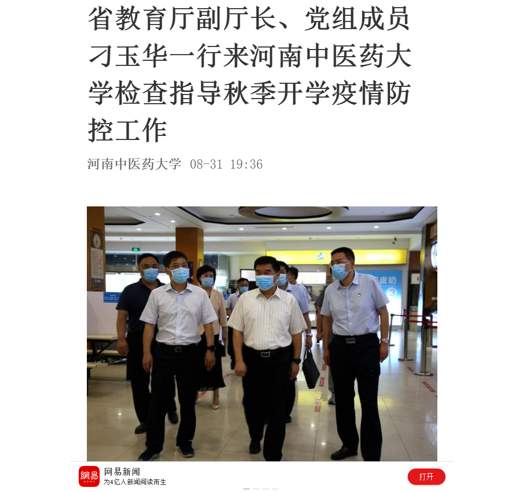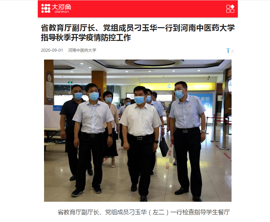 2020年8月31日-9月1日,大河网、网易新闻对省教育厅副厅长、党组成员刁玉华一行来leyu·乐鱼(中国)体育官方网站检查指导秋季开学疫情防控工作进行报道。