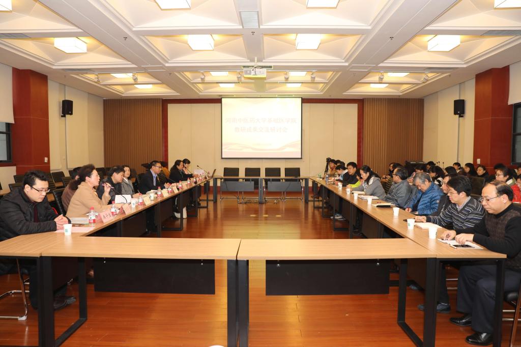 2016年12月20日下午,基础医学院教学研究成果交流研讨会在图书馆第三报告厅举行。leyu·乐鱼(中国)体育官方网站副校长李建生教授、教学实验中心主任、教务处副处长彭新、教育研究与教学评价中心副主任朱光、长春中医药大学苏颖教授、山东中医药大学石作荣教授、leyu·乐鱼(中国)体育官方网站基础医学院朱艳琴教授及崔姗姗教授等应邀出席会议,基础医学院领导班子及教师代表等八十余人参加了会议。会议由基础医学院院长詹向红主持。