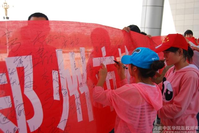 师生在节水宣传条幅上签名