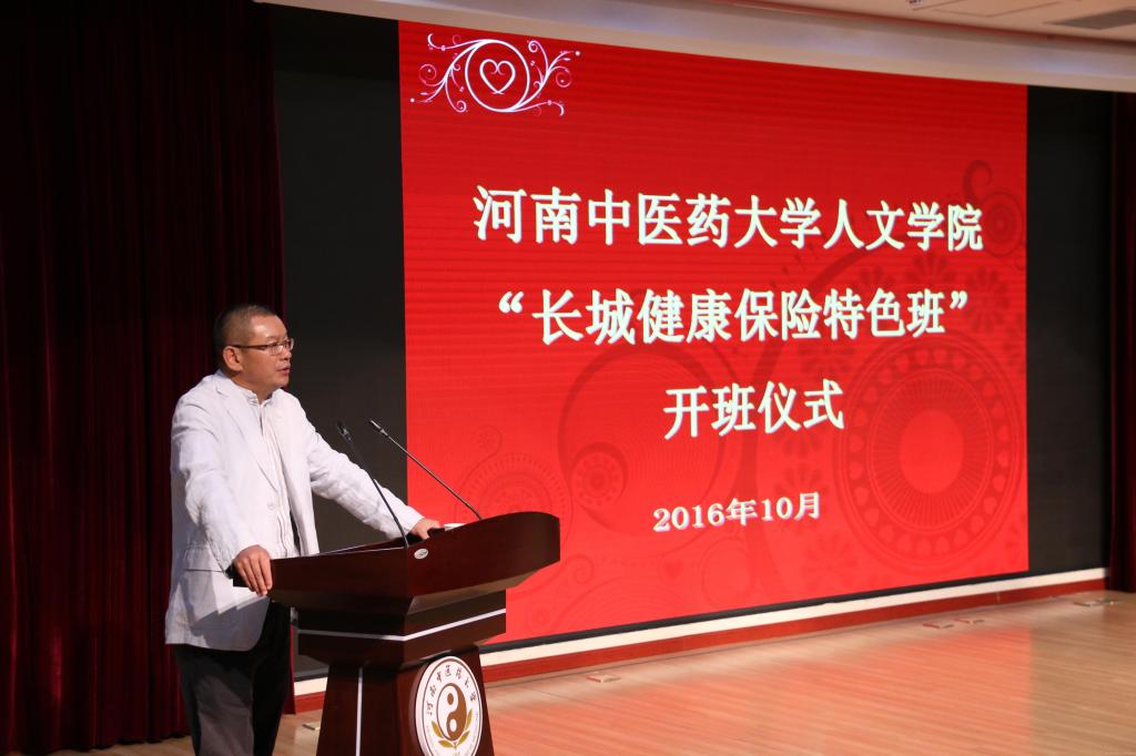 开班仪式由人文学院党委副书记庞亚宾主持。长城保险经纪有限公司董事长申河、台湾威盛保险经纪人公司董事长王信力、长城保险经纪有限公司郑州分公司经理张峰等企业界人士,人文学院党委书记王剑锋、院长张丽青、副院长段晓鹏及部分教师、首届“长城健康保险特色班”21名同学等共同参加了开班仪式。