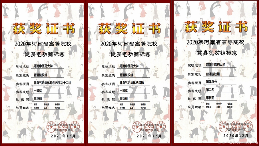 此次锦标赛结合我省疫情防控和体育工作要求,采用线上方式进行,是我省高等院校最高水平的健身气功赛事,分为普通院校组和体育院(系)组两个组别,全省56支普通院校代表队和19支体育院(系)代表队共450余名运动员参赛。学校高度重视此次比赛,体育学院积极组织,认真筹备,教练与参赛队员积极发扬奋勇拼搏的精神,刻苦训练。经过激烈紧张竞赛,最终leyu·乐鱼(中国)体育官方网站代表队荣获2020年河南省高等院校健身气功锦标赛普通院校组八段锦项目一等奖和导引养生功十二法项目一等奖,并以锦标赛团体总分第二名的好成绩为学校争得了荣誉。