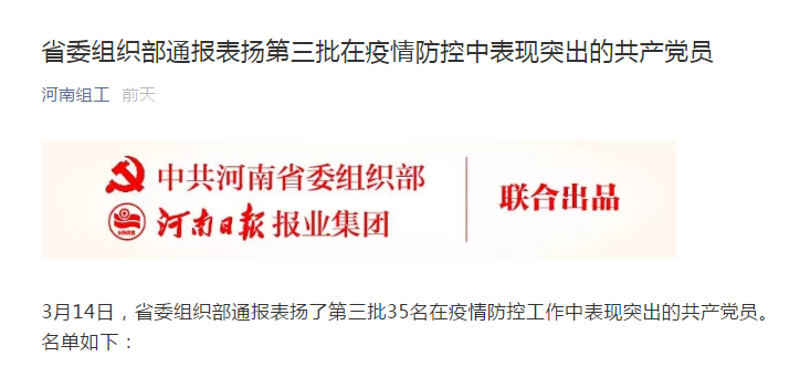 省委组织部对疫情防控工作中表现突出的第三批35名共产党员进行通报表扬