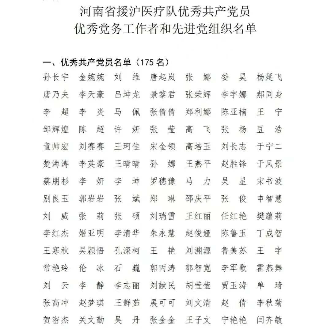 一附院崔青荣、梁浩卫等12名同志,二附院温世宝、牛朝阳等8名同志,三附院胡兴旺获“优秀共产党员”称号;一附院乔东鸽、曹方等4名同志,二附院胡仕祥、杜旭召获“优秀党务工作者”称号;一附院援沪医疗队临时党总支第三支部、二附院河南援沪中医医疗队临时党支部获“先进党组织”称号。