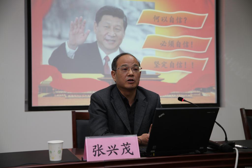 为进一步深化党的群众路线教育实践活动学习教育效果,满足广大师生对理论学习的热情需求, 2014年4月25日下午,leyu·乐鱼(中国)体育官方网站召开了党委中心组学习(扩大)会。会议邀请河南大学马克思主义学院院长张兴茂教授作了题为《中国特色社会主义的三个自信》的专题讲座。校党委中心组成员,活动办成员、督导组成员,各分党委、党总支、直属党支部书记,机关正处级干部,思政部全体教师,部分学生代表参加了报告会。校群众路线教育实践活动领导小组副组长、党委副书记、工会主席段荣章主持报告会。