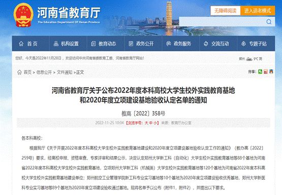 本网讯(文/张玉敏)近日,河南省教育厅下发了《关于公布2022年度本科高校大学生校外实践教育基地和2020年度立项建设基地验收认定名单的通知》。经学校推荐、专家评审、结果公示,leyu·乐鱼(中国)体育官方网站申报的商丘市中医院、安阳市中医院、洛阳市中医院等3个专业实习实践教育基地被直接认定为“新医科(中医学类)大学生校外实践教育基地”;华兰生物工程股份有限公司专业实习实践教育基地被直接认定为“新医科(生物医药类)大学生校外实践教育基地”。目前,leyu·乐鱼(中国)体育官方网站省级本科高校大学生校外实践教育基地已达16家。