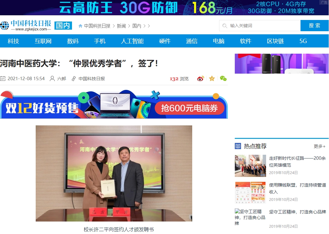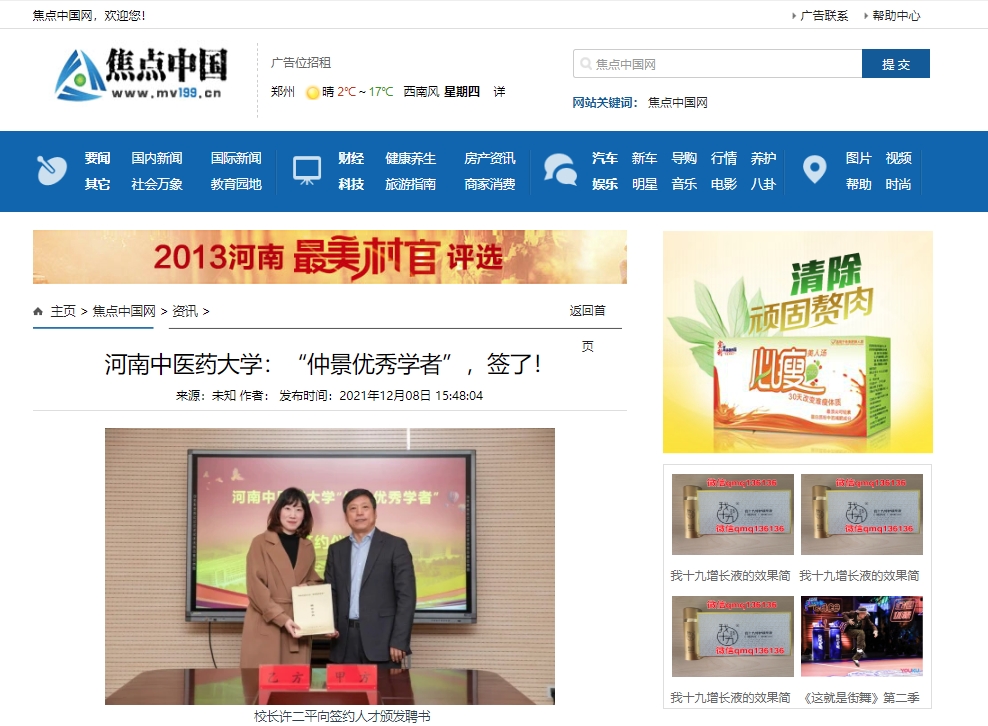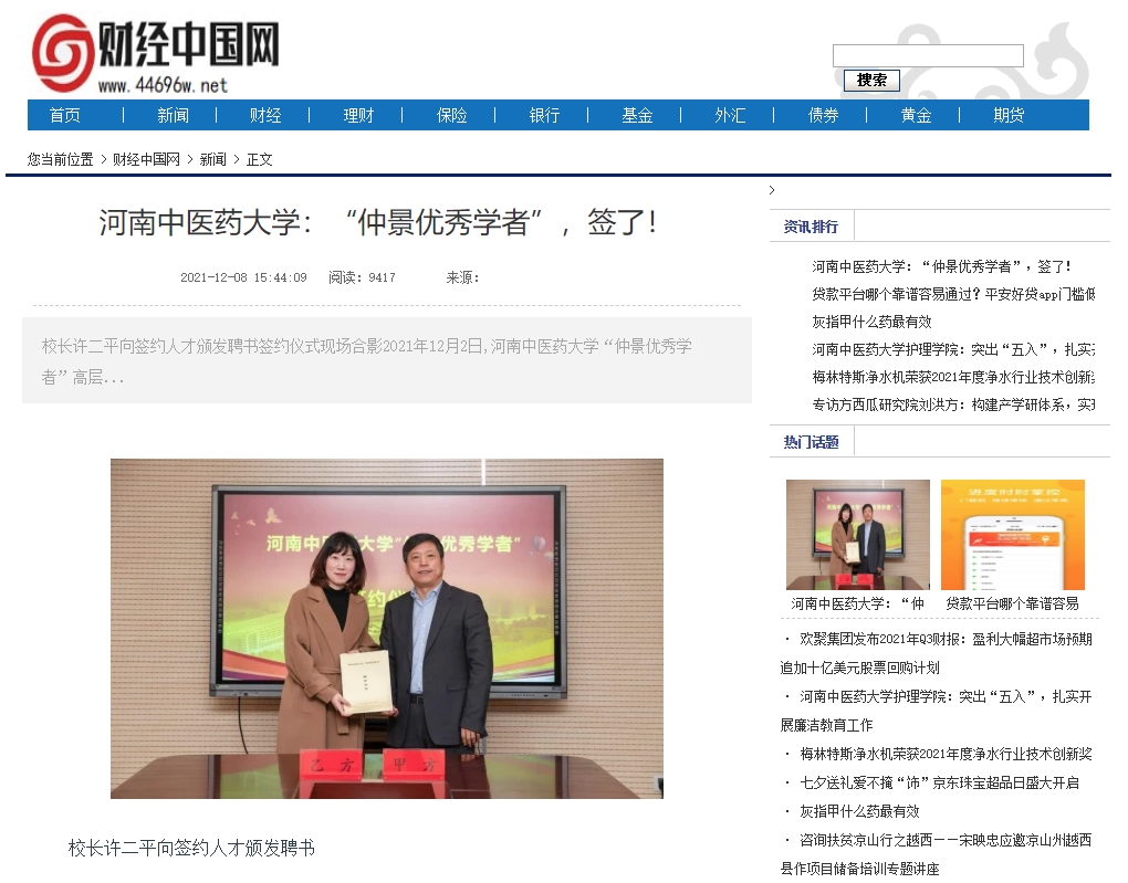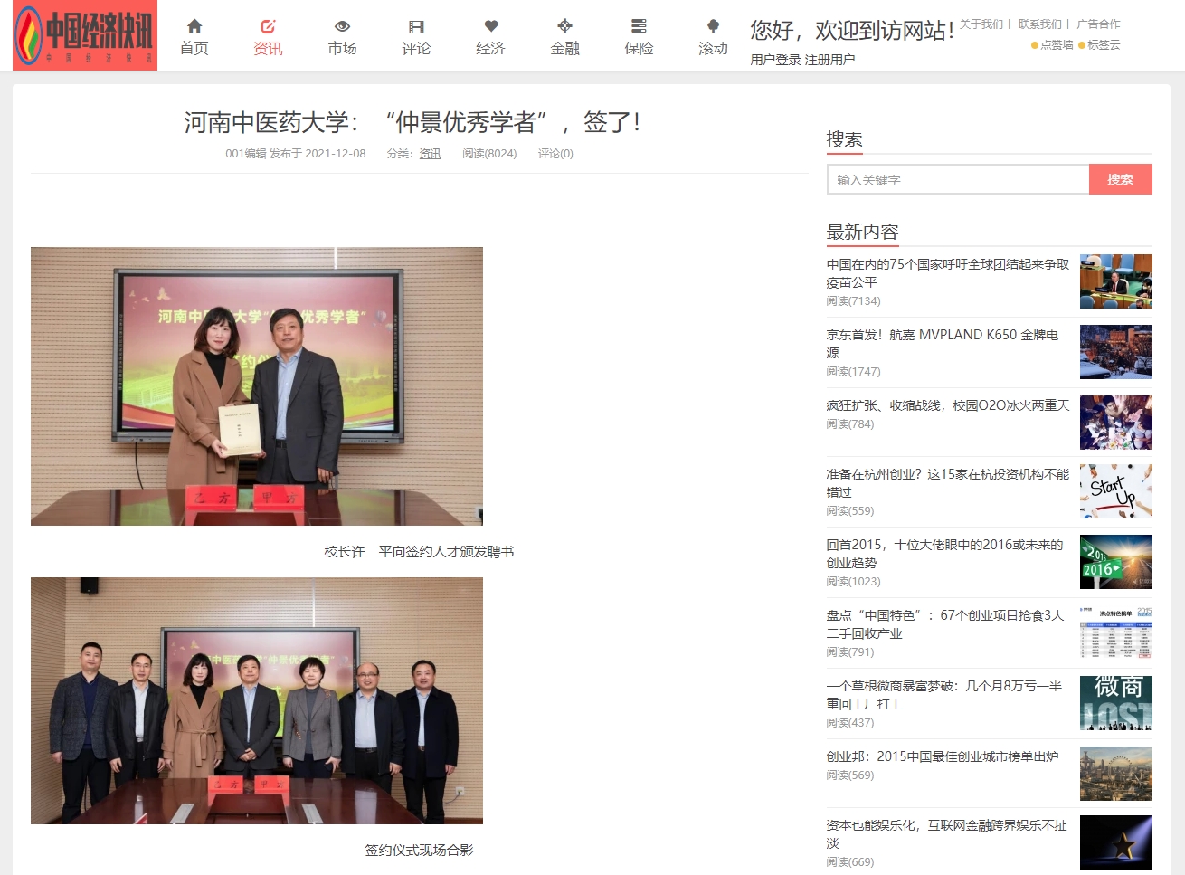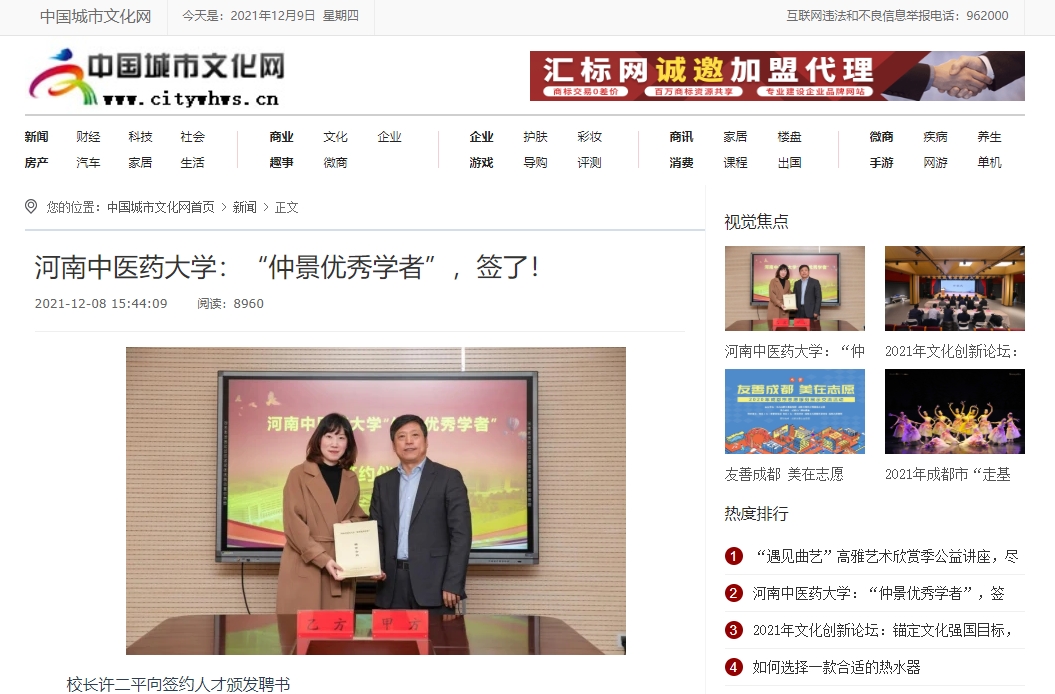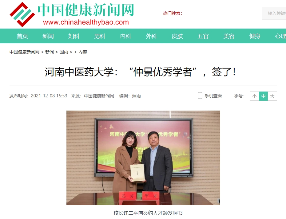 编者按:2021年12月8日,中国文化热点、中国经济快讯、中国生活快讯、中国企业商报、中国之窗、焦点中国网、中国科技日报、财经中国、中国健康新闻网、中国城市文化网等多家媒体对leyu·乐鱼(中国)体育官方网站举行“仲景优秀学者”高层次人才签约仪式进行报道。