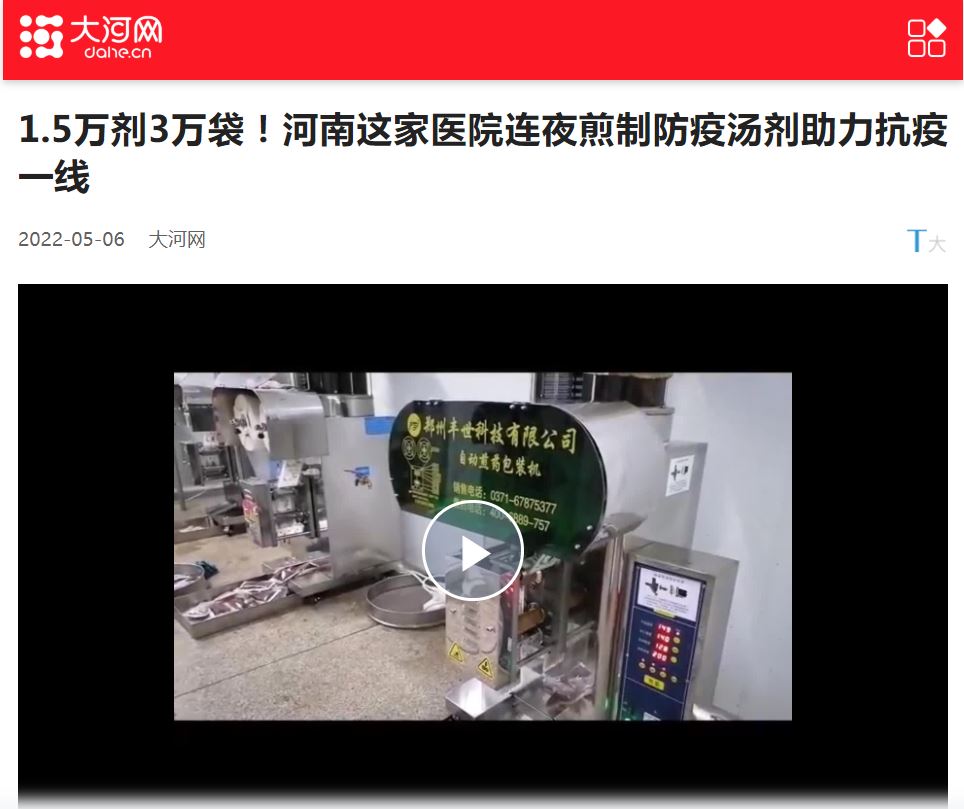 2022年5月6日,大河网对leyu·乐鱼(中国)体育官方网站一附院连夜煎制防疫汤剂1.5万剂3万袋助力抗疫一线进行报道。