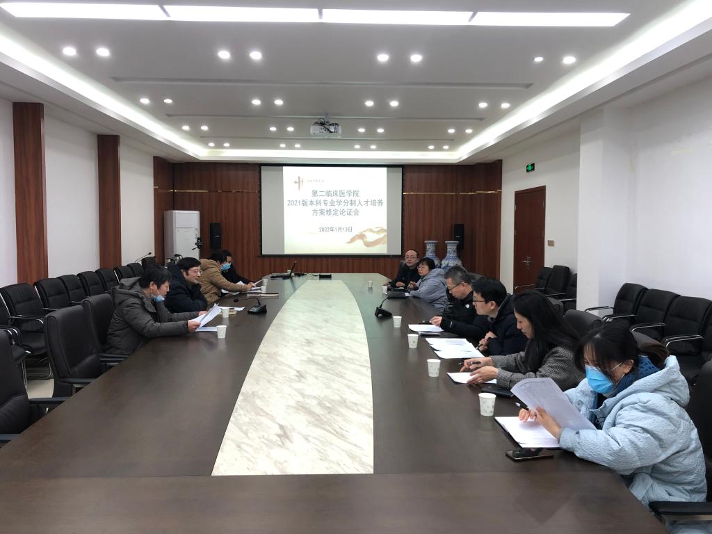 本网讯(文图/常学辉)2022年1月13日下午,第二临床医学院2021版专业人才培养方案修订论证会在东风路校区教学行政楼二楼会议室召开,医院督导组成员、教研室主任、教师代表等10余人参加论证会,会议由二附院副院长朱光主持。