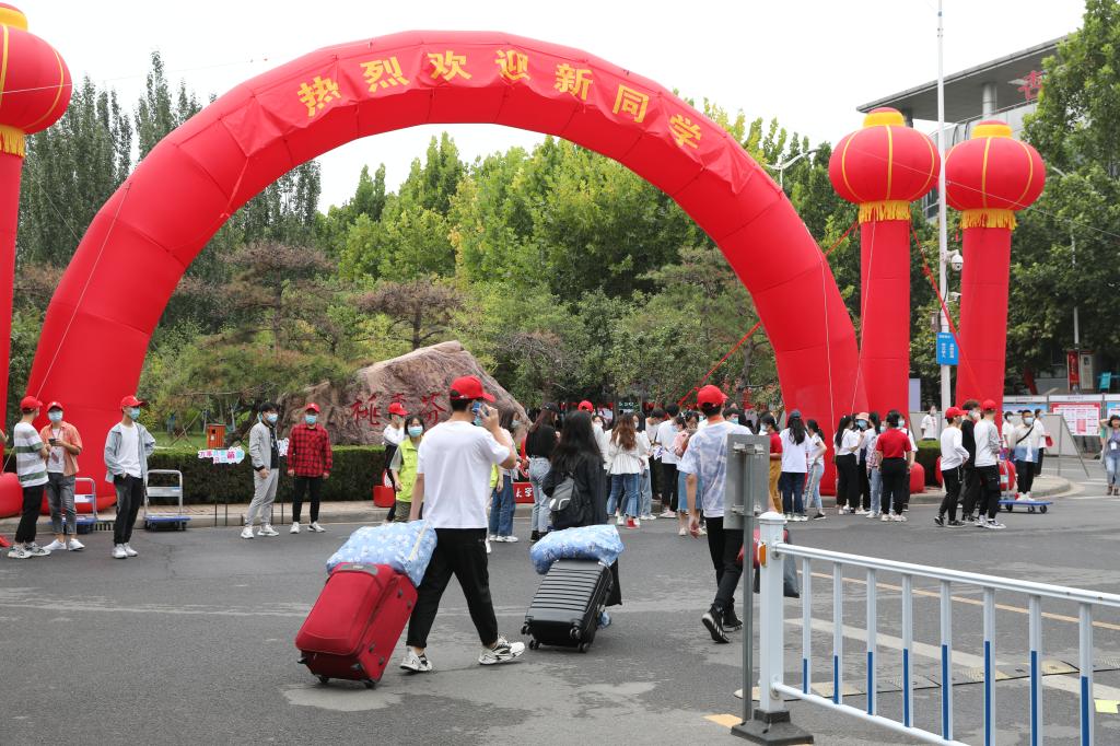 受疫情影响,今年的报到流程与往年大不相同。线上提交返校申请,线下体温测量、行李消毒、扫码入校、间隔排队,专属通道入校……开启了新生进入大学校门的第一步。