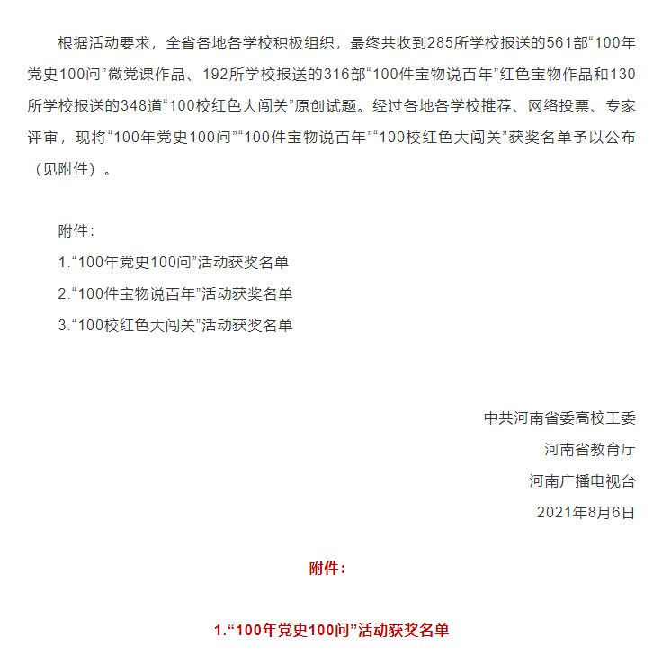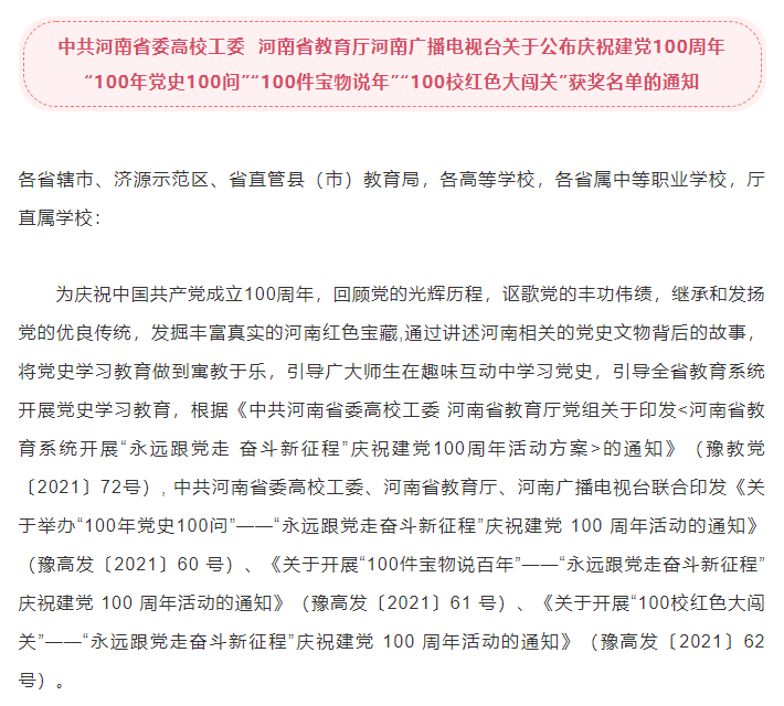 本网讯(文图/左娅)近日,河南省委高校工委、河南省教育厅、河南广播电视台联合举办的庆祝建党100周年“100年党史100问”“100件宝物说百年”“100校红色大闯关”系列活动获奖名单公布,经过层层遴选、网络投票、专家评审三个环节的评比,leyu·乐鱼(中国)体育官方网站报送的一临床内科党总支左娅的参赛作品《大爱无私 延泰后世》,荣获“100年党史100问”微党课作品特等奖及最佳个人微党课创作奖。