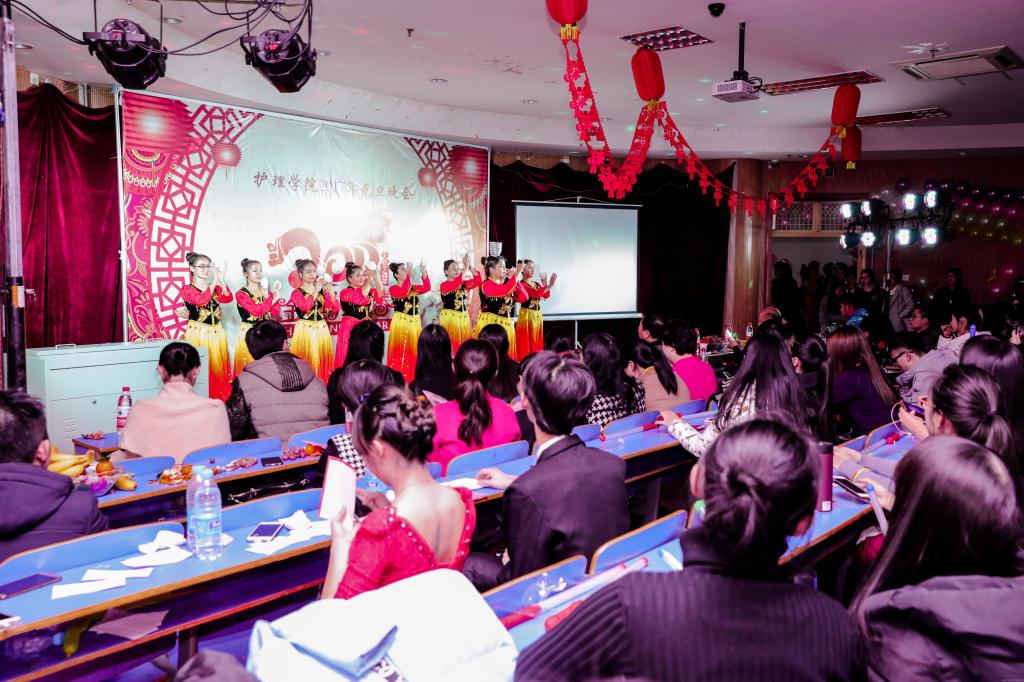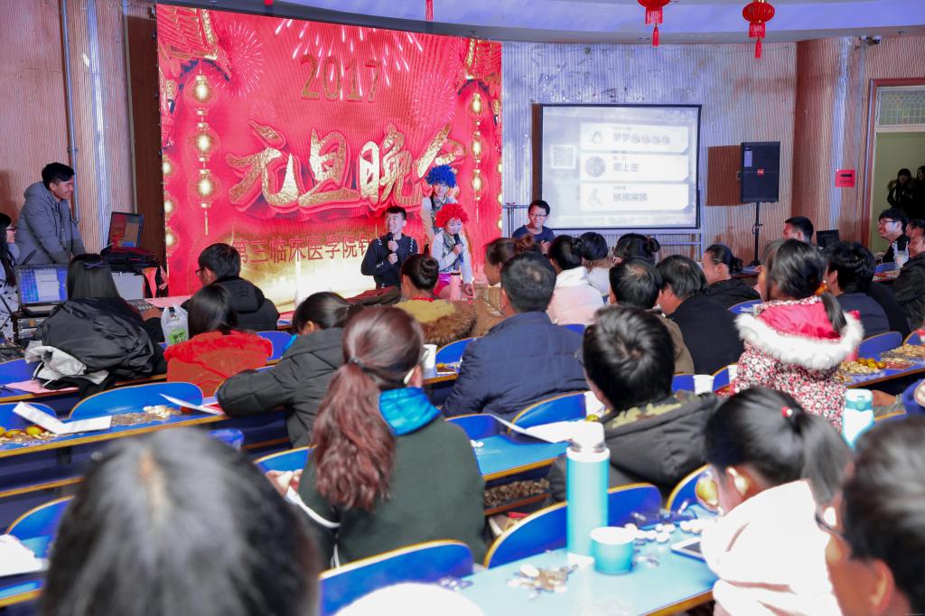 第一临床医学院的器乐演奏《古风行》和太极展示《动静寓山河》,一个宛转悠扬,一个恢弘大气,中国传统文化的深厚底蕴自然流露,校党委书记孙建中全程观看节目,并不时为精彩节目拍手鼓励。第二临床医学院擂鼓队擂响《盛世欢歌》,展现了中医人昂扬向上的面貌,表达了同学们对新一年的美好憧憬和向往,校长许二平现场观看节目并向师生祝福新年,他回顾了2016年学校的几件大事,表示自己会肩负起校长的责任,和全校师生一道促进学校工作再上新台阶。B-box《思念是一种病》歌声和美,深情款款,全场师生不约而同亮起手机灯光,针灸推拿学院晚会现场顿时洒落成一片星空。基础医学院的歌曲串烧新颖独特,对《画心》《掀起你的盖头来》等经典歌曲的歌词改编,形象讲解了解剖知识,展现了中医之魅力。药学院学工办高巍、李旭宁两位老师用韩文深情唱响《I believe》,舒展的曲调仿佛在诉说leyu·乐鱼(中国)体育官方网站教职工对学校发展的相信和坚持。震撼铿锵的音乐,潇洒娴熟的动作,人文学院的悠悠球表演《旋转》是一场视觉的盛宴,更勾起了不少人对童年的记忆。一群身穿校服的男生女生或一起练习,或自顾自地默默练习,外语学院的晚会现场似乎变成了空旷的球场,只有拍球撞击地面的声音,直至最后一位男生高喊“我要打排球”才打破寂静,花式拍球表演《排球少男少女》利用这种冲突把当代大学生对运动的热爱表现得十分到位。豫剧唱段《老百姓心中有杆秤》唱词朗朗上口,在信息技术学院教师许玉龙声情并茂的演绎下,愈发动人,表达了他想要做一名“焦裕禄式”的好老师的朴素愿望。护理学院的9名维吾尔族女孩随着音乐翩翩起舞,新疆传统舞蹈《赛乃姆》轻松欢快,节奏自如,祖国少数民族的独特之美形象生动。穿插在节目中的一则短视频记录了康复医学院建院以来的发展,更传达了对未来的祝福,亲切的话语不禁让现场每一个人心头一暖。学校教职工舞蹈队也参加了演出活动,应邀到信息技术学院、基础医学院、康复学院进行了演出,受到了师生们的热烈欢迎。