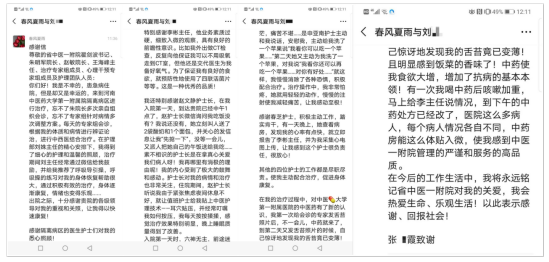 在我的治疗过程中,对河南中医大学第一附属医院的中医药有了新的认识,我第一次给会诊的专家发舌苔照片后,不一会儿,中药就来了,到第二天又发舌苔照片的时候,自己惊讶地发现我的舌苔竟已变薄!且明显感到饭菜的香味了!中药使我食欲大增,增加了抗病的基本本领!有一次我喝中药后咳嗽加重,马上给李主任说情况,到下午的中药处方已经改了,医院这么多病人,每个病人情况各自不同,中药房能这么体贴入微,使我感到中医一附院管理的严谨和服务的高品质。