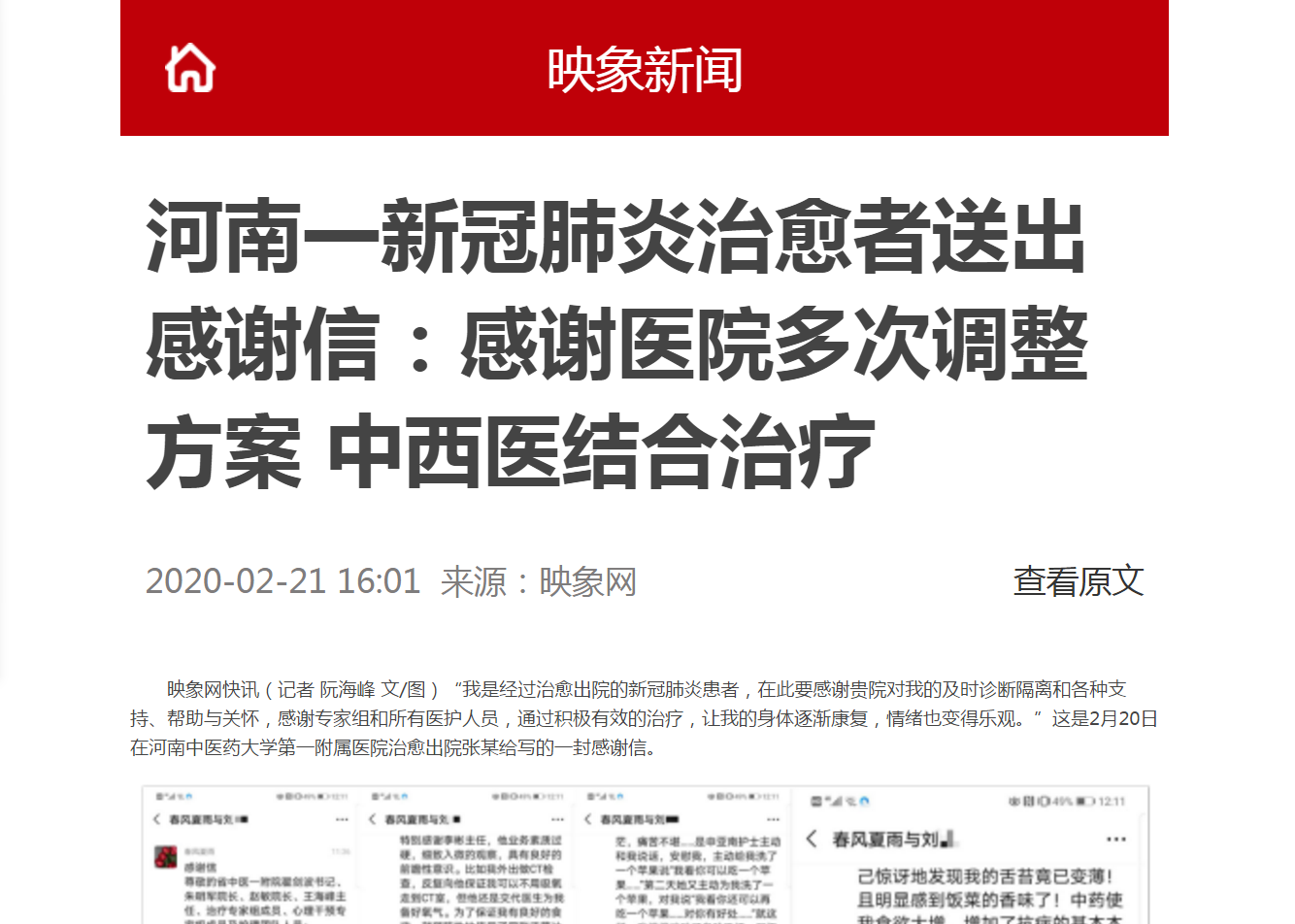 河南一新冠肺炎治愈者送出感谢信:感谢医院多次调整方案 中西医结合治疗