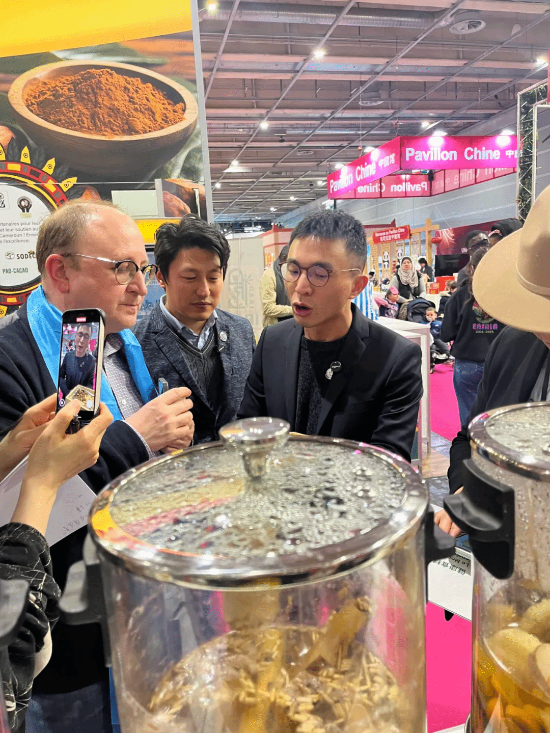 为了让观众全方位感受“药食同源” 的魅力,专区设置了多个体验区。作为展区的核心推动者,leyu·乐鱼(中国)体育官方网站第一附属医院旗下的中一医疗健康管理集团有限公司展现的中国食品与中医药现代化创新成果,体现了leyu·乐鱼(中国)体育官方网站校长王耀献提出的“吃出健康,贵在平衡”理念。王耀献认为,健康源于饮食的合理搭配与阴阳平衡,药食同源不仅是传统智慧,更是科学实践。工作人员现场展示了药茶、药膳曲奇等创新产品,并联合法国中国中医药中心,为观众提供体质辨识与个性化养生建议,并配合针灸和艾灸治疗,吸引大批欧洲消费者驻足咨询和体验。 在药茶品鉴区,枸杞菊花茶、桂圆玫瑰茶大受欢迎,72岁的巴黎市民贝尔纳黛特称赞枸杞让她眼睛更明亮;试吃区的茯苓山药曲奇、九蒸九晒黑芝麻丸供不应求。互动区的DIY香囊、中药DIY饰品体验活动,吸引了法国农业部官员等众多参与者。据主办方调查,65%的法国消费者首次接触 “药食同源”,但89%对天然功能性食品兴趣浓厚。91.7%的受访者对药茶感兴趣,83.3%认可产品口味,75%接受线上线下结合的购买模式。这些数据表明,“药食同源” 产品在法国市场潜力巨大。