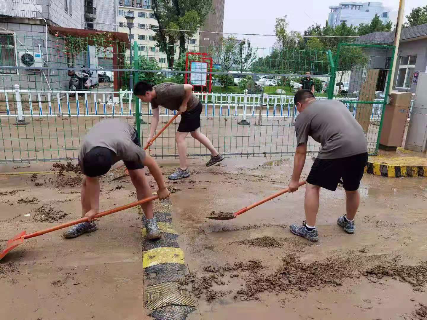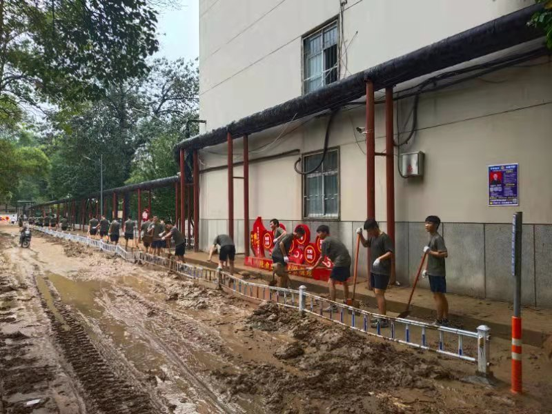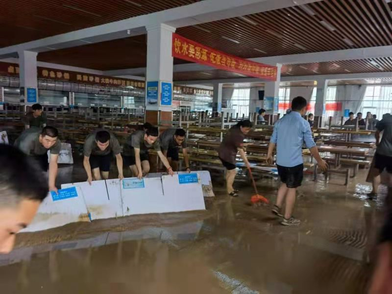 汗水湿透衣背。7月22日上午9时,在leyu·乐鱼(中国)体育官方网站武装部、保卫处负责同志和15名军训教官的带领下,85名军训队员抵达东明路校区。他们根据现场情况,快速制定抗洪排水方案,进行了周密部署,并迅速投入清理道路泥土等抗洪排水工作。校区内道路布满淤泥、路面大面积被淹,泥浆和着雨水冲出来的垃圾铺满路面。同志们不怕脏,不怕苦,士气高昂,精神抖擞,齐心协力清淤泥,保畅通。食堂、宿舍楼、道路上,随处都能看到大家挥洒汗水的身影。3个小时过去了,在大家分秒必争、全力奋战下,东明路校区积水清理完毕,路面焕然一新,各场地整洁干洁,解决了困扰师生的校区大面积被淹的困境。“军训官兵、真是好样的!现在的年轻人,真中!”现场不时发出感动、赞美声。