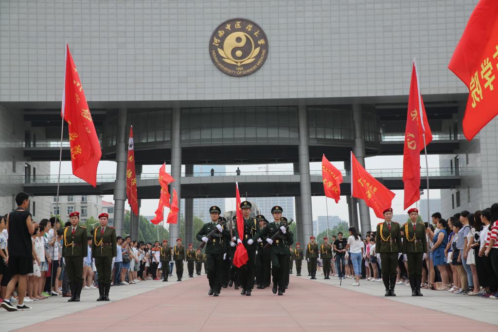 在全体师生的注目下,国旗护卫队队员迈着整齐有力的步伐护送五星红旗入场,行礼完毕,伴随《中华人民共和国国歌》,五星红旗冉冉升起,迎风飘扬。师生行注目礼,胸中激荡起对祖国的无限热爱之情,现场气氛庄严而神圣。