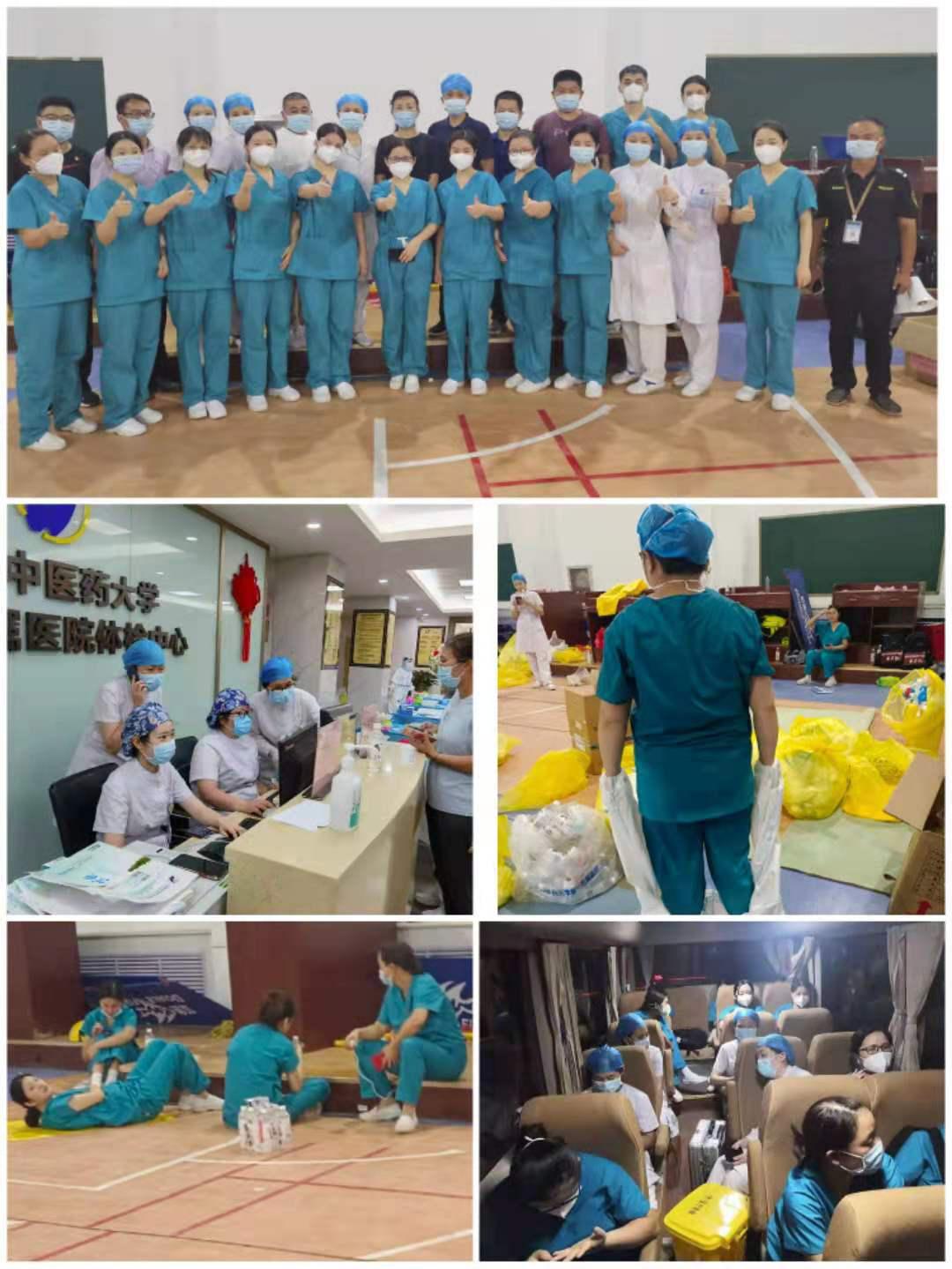 队员们是这样说的,更是这样做的。由医院护理部抽调的13名一线护理人员组成的采集队在医院团委、学生科、研究生科全程配合下,从下午3点开始采集一直坚持到凌晨1点。晚上8点左右,眼看现场队员疲惫不堪,张婉红马上向一附院体检中心求助,体检中心主任王飞带领5名护理人员放下手头工作20分钟就赶到现场,一刻不停轮换高温下几近晕倒的那几位队员。轮转下来的队员稍事休息,就第一时间回到一线。采集力量的充实让采样速度大大加快,凌晨1点,采集近3000人份的任务圆满完成。队员们脱下防护服的那一刻,隔离衣里面的洗手衣都如同水洗一般湿哒哒的,但完成任务的喜悦挂在队员们的眼角眉梢,冲淡了一切疲惫。体检中心的6名同志星夜兼程回到岗位,继续下午耽误的工作,一直忙碌到深夜三点,才完成所有采集核酸的条码生成打印粘贴工作并安全将采集的标本送至检验科,等候多时的检验工作人员开动所有机器连夜检测,5日上午10点完成所有工作。