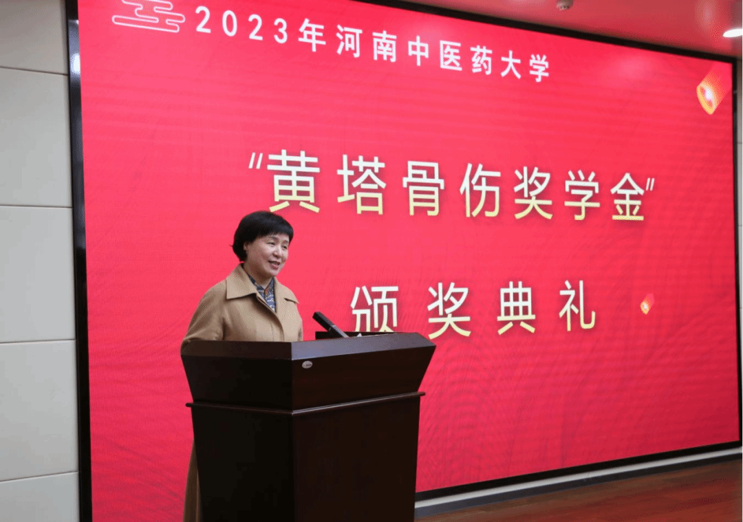 田力在讲话中介绍了学校的基本情况,对新乡黄塔骨伤医院情系学生、捐资助学的善举表示感谢。她指出,此次捐款既是对学生的鼓舞和激励,更是对学生的感恩教育,将进一步教育、引导同学们将中医骨伤技艺传承并发扬光大。田力向获奖同学提出三点希望:一要学会在逆境中直面困难,克服挫折。二要不断提高创新思维,拒绝平庸,勇于创新。三要仰望星空,脚踏实地。她鼓励同学们从实干中增长阅历,丰富充实自我,希望同学们将“厚德博学 承古拓新”的校训精神内化于心、外化于行,心存感激、砥砺奋进,在担当中得历练、在尽责中获成长,勇担时代使命、书写精彩人生。