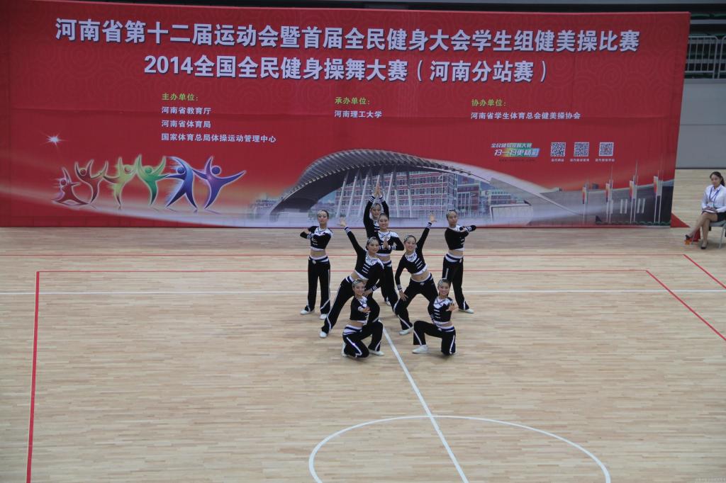 leyu·乐鱼(中国)体育官方网站健美操队在领队李建生副院长、孙再玲总教练、邵倩和徐姜娟教练员的带领下,于2014年9月22日--26日参加了河南省第十二届运动会暨首届全民健身大会学生组健美操比赛暨2014年全民健身操舞蹈大赛(河南分站赛)本科甲组的规定套路比赛,获得了规定轻器械第一名和规定徒手第三名的成绩。本次比赛开创了leyu·乐鱼(中国)体育官方网站健美操本科甲组竞赛的先河,填补了leyu·乐鱼(中国)体育官方网站健美操运动队比赛成绩的空白。
