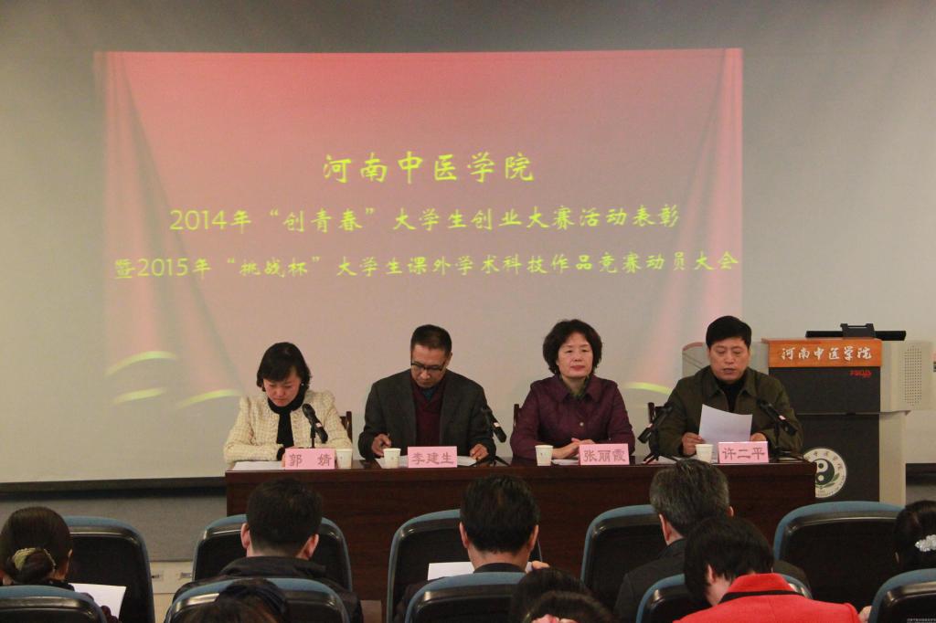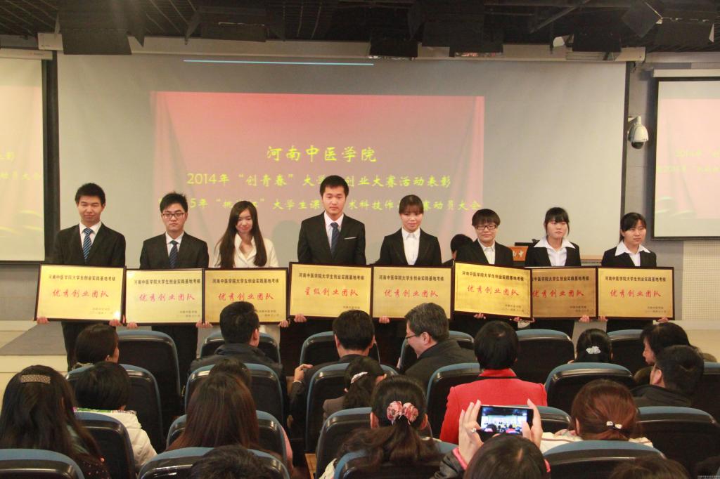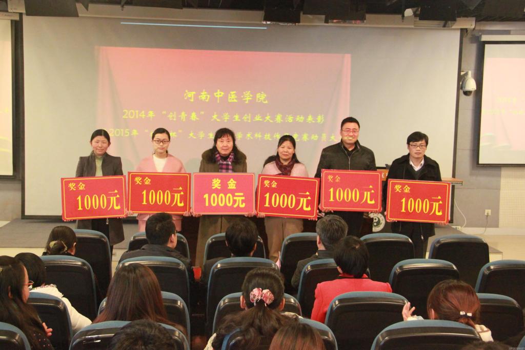 会上,许二平副院长首先宣布了在全国、河南省与leyu·乐鱼(中国)体育官方网站“创青春”大学生创业大赛中获奖的个人以及在大学生创业实践基地年度考核中成绩优异的创业团队。随后,又向大家宣读了《关于表彰leyu·乐鱼(中国)体育官方网站“挑战杯”大学生创业大赛先进集体和个人的决定》和《关于表彰河南中医学院大学生创业实践基地年度优秀创业团队的决定》。接下来,大会对在“创青春”全国、河南省及leyu·乐鱼(中国)体育官方网站大学生创业大赛中获奖的学生代表、获奖作品指导老师、获团体奖单位及leyu·乐鱼(中国)体育官方网站大学生创业实践基地优秀创业团队进行了表彰。本次共表彰国家级获奖作品1件,省级获奖作品9件,校级获奖作品60件。人文学院获得leyu·乐鱼(中国)体育官方网站“创青春”大学生创业大赛“挑战杯”荣誉称号,药学院获得“特殊贡献奖”荣誉称号,研究生处、第一临床学院、第二临床学院、针灸推拿学院获“优秀组织单位”荣誉称号。颁奖仪式结束后,李建生副院长宣读了《关于举办leyu·乐鱼(中国)体育官方网站第六届“挑战杯”大学生课外学术科技作品竞赛的通知》,并对第六届“挑战杯”大学生课外学术科技作品竞赛工作进行了安排部署。
