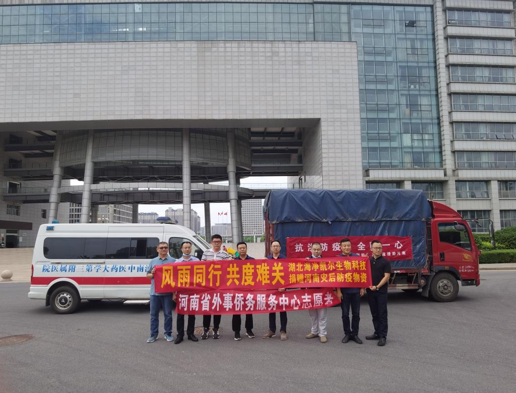 2021年7月30日上午,湖北海净凯尔生物科技有限公司负责人张嘉一行带领一辆悬挂有“抗洪防疫全国一心”条幅的货车驶入leyu·乐鱼(中国)体育官方网站,向学校捐赠1200瓶消毒液。校长办公室及第三临床医学院同志代表学校接受了捐赠,并向河南省外事侨务服务中心和湖北海净凯尔生物科技有限公司的精准援助表示由衷感谢。