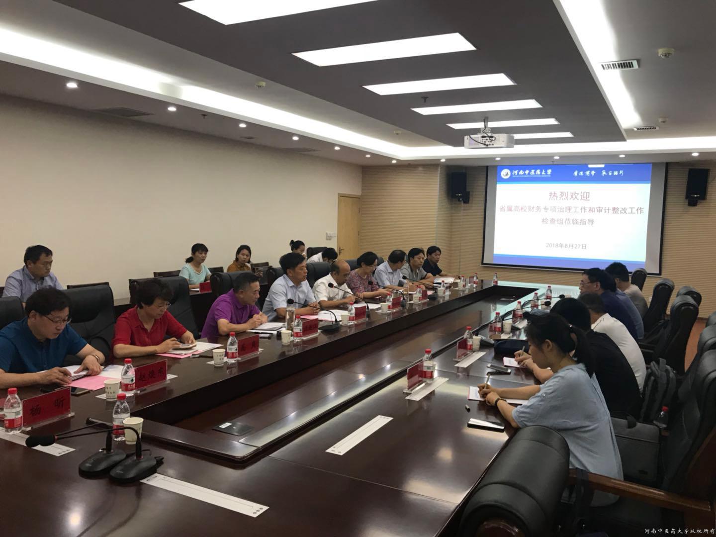根据《省属高校财务专项治理工作和审计整改工作进行检查的通知》要求,按照河南省教育厅党组统一部署,2018年8月27日下午,省属高校财务专项治理和审计整改工作检查组组长牛吉平一行6人,对leyu·乐鱼(中国)体育官方网站进行为期3天的检查,并在BS605会议室召开了检查工作会。校长许二平、副校长冯卫生、计划财务处、审计处、国资处、基建处、后勤服务中心、校产公司等部门负责人参加了会议,会议由副校长冯卫生主持。