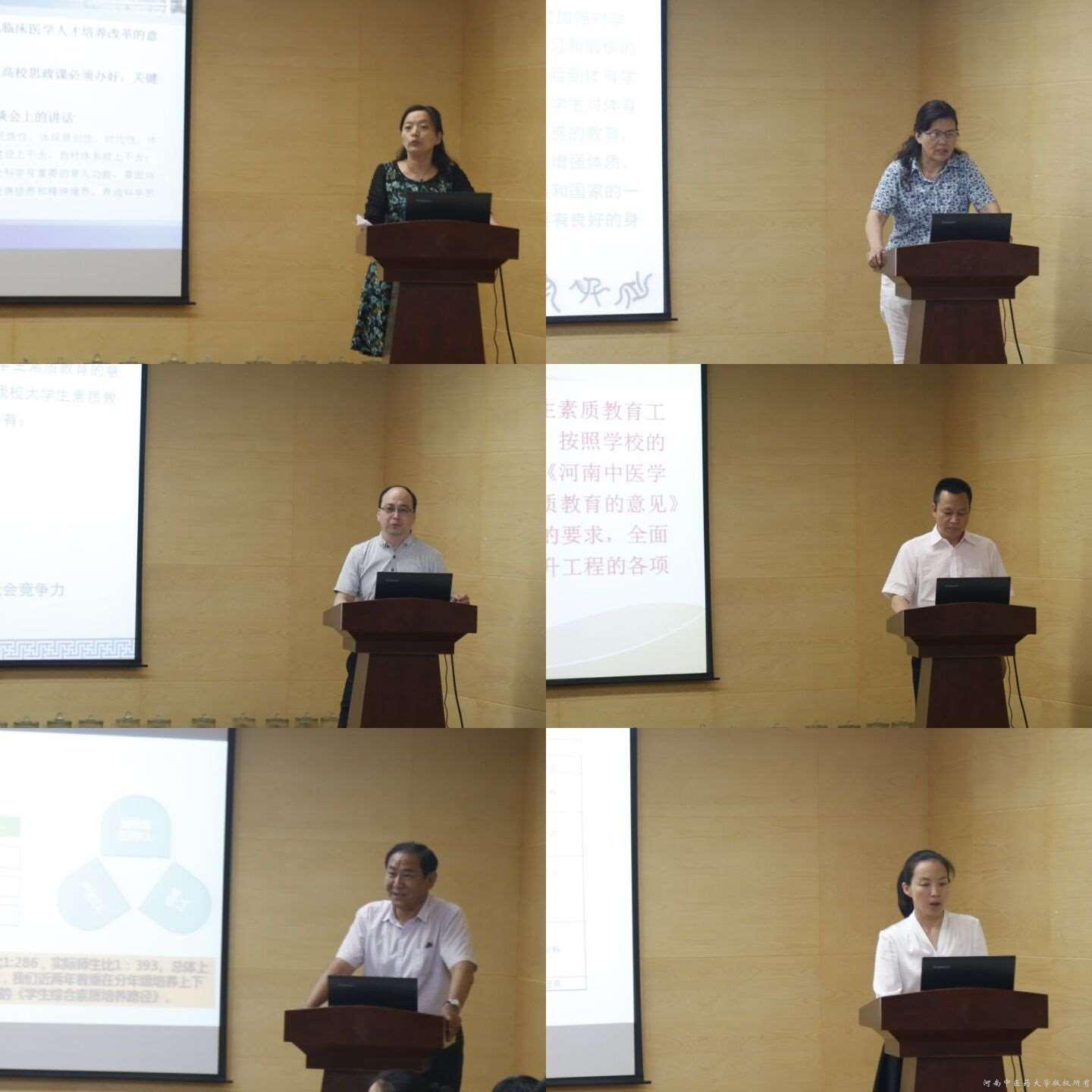 会上,八个职能部门和两个二级学院代表围绕三年来大学生素质教育工作进展情况分别进行了总结汇报。学工部部长、学生处处长刘金厂从学工部作为大学生素质教育领导小组办公室所做的工作、本部门承担的大学生心理健康教育工作以及今后工作思路等方面进行了汇报;校团委汇报了通过抓团支部活力工程、筑梦英才实践班、社会实践、志愿者活动、挑战杯、学生社团等重点品牌活动,提升广大同学思想道德素质和能力素养;教务处汇报了优化人才培养方案,科学安排课程设置,强化实践教学环节,提升学生实践动手能力等方面的工作;宣传部汇报了以德润身,以文化人,打造特色大学文化氛围,加强大学生思想道德建设等方面的工作;思政部汇报了加强医德教育,提高学生人文素养,提升师生高尚医德和社会责任感等方面的工作;体育教研部从举办传统保健运动会,开展中医特色传统保健活动,推动体育课程教学改革等方面进行了汇报;招就处从加强职业发展教育,提高就业创业指导与服务水平,提升大学生就业能力和社会竞争力等方面进行了汇报;图书馆从依托新馆建设,丰富馆藏资源,举办读书月活动,营造书香校园等方面进行汇报。另外,作为二级学院学生工作典型代表,针灸推拿学院以“分年级、分层次的大学生思想政治教育路径”品牌活动为重点,从分级培养路径新举措和实践育人工作显著成效等方面进行了汇报;信息技术学院以“先进引领,学长导航,提升新生入学教育效果” 品牌活动为重点,从强化学生专业素质 ,打造“电脑医院”等服务品牌,提升学生实践服务意识和创新创业水平等方面进行了总结汇报。各部门在总结汇报主要工作措施、成效与经验基础上,对工作中存在问题和下一步工作思路进行了交流。