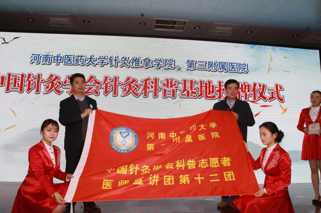 中国针灸学会副会长刘智斌为科普教育基地授牌,并为科普宣讲团授旗
