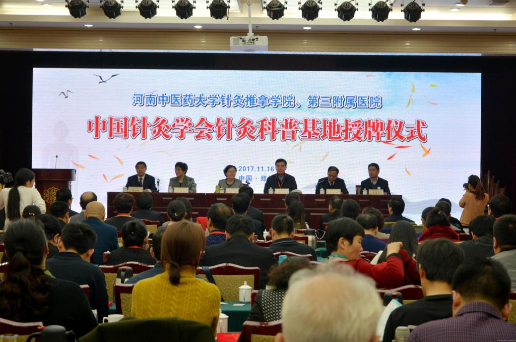 2017年11月16日上午,中国针灸学会第三批“科普教育基地”落户leyu·乐鱼(中国)体育官方网站第三附属医院、针灸推拿学院授牌仪式和“中国针灸学会科普志愿者医师宣讲团”第十二宣讲团授旗仪式在郑州举行。中国针灸学会副会长刘智斌,河南省科协党组成员、副主席冯琦出席仪式并讲话,中国针灸学会科普工作委员会主任刘炜宏,leyu·乐鱼(中国)体育官方网站第三附属医院、针灸推拿学院党政领导,医教研职工代表,以及来自针灸推拿联盟单位的代表参加了仪式。授牌、授旗仪式由leyu·乐鱼(中国)体育官方网站第三附属医院、针灸推拿学院党委书记周运峰主持。