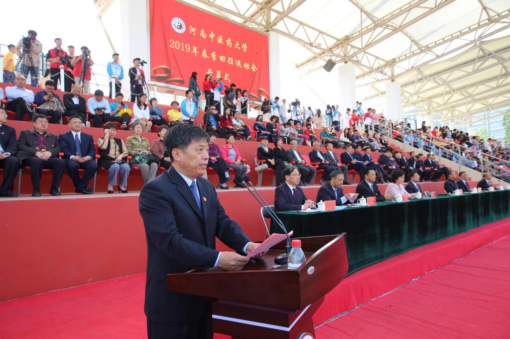 在庄严的国歌声后,校长许二平致开幕词。他代表学校和大会组委会对运动会的举行表示祝贺,向为运动会付出辛勤劳动的师生表示感谢,向裁判员、教练员、运动员表达了美好的祝愿和诚挚的谢意。他表示,长期以来,学校高度重视体育运动的开展,在推进学校转型发展的过程中,不断完善体育教学管理机制,创新体育课程设置,积极组织丰富多彩的体育赛事,充分发挥学校体育竞赛吸引广大师生参与体育锻炼的作用,激发广大师生对体育运动的热爱和激情,并总结了学校2018年体育工作取得的突出成绩,安排部署了2019年各项工作。许二平强调了运动的积极意义,分别对运动员、裁判员、工作人员和全体师生提出了要求,希望全校师生要以运动会为契机,牢固树立“健康第一”的理念,把体育运动变成感受生活、充实自我、享受人生的重要方式,把体育精神融入到学习、工作和生活中去,以更加健康的体魄和积极向上的热情,为推动学校建设国际知名、国内一流的教学研究型中医药大学做出更大贡献,以优异成绩向中华人民共和国成立70周年献礼。