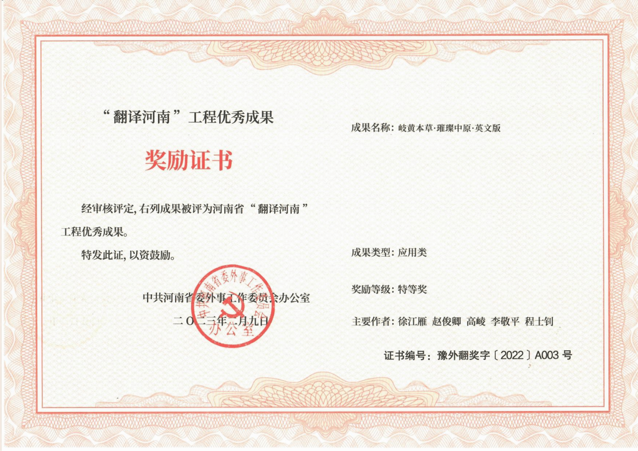 本网讯(文图/高崚)近日,中共河南省委外事工作委员会办公室对2022年度“翻译河南”工程优秀成果奖进行通报表彰,leyu·乐鱼(中国)体育官方网站选送的《岐黄本草·璀璨中原·英文版》等5项作品,分别荣获特等奖、一等奖和二等奖。