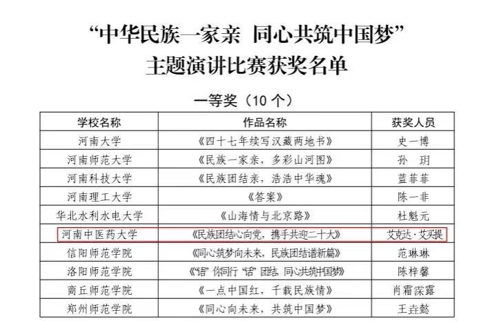 “中华民族一家亲 同心共筑中国梦”主题演讲比赛由中共河南省委教育工委、河南省教育厅主办,旨在以此次活动为契机,推动全省高校师生深入学习习近平总书记关于加强和改进民族工作的重要思想,贯彻落实中央民族工作会议精神,促进高校师生进一步铸牢中华民族共同体意识。比赛历时两个月,经过校内初赛、全省复赛、全省决赛三个环节,leyu·乐鱼(中国)体育官方网站学生艾克达·艾买提在复赛环节从100多所高校推荐的选手中脱颖而出进入决赛,最终获得个人一等奖。此次演讲比赛全省共评出个人一等奖10名,二等奖12名,三等奖18名,18所高校荣获“优秀组织奖”。