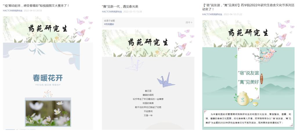 创意互动,切实丰富校园活动。为满足疫情期间学生的精神文化需求,药学院结合当前实际情况和学生需求策划了多种别出心裁的活动,丰富了学生生活。学院开展“豫”见新一代,遇见春光美图文征稿活动和“‘疫’期动起来,感受春精彩”研究生短视频图文征集比赛,鼓励研究生走出宿舍、走出实验室,走向操场,感受春暖花开之美,体验校园生活之乐;结合实际开展了2022年“‘宿’说友谊,‘寓’见美好”研究生宿舍文化节系列活动,营造了浓厚的宿舍文化育人氛围。通过精心策划、创意打造丰富多彩的校园活动,同学们在实行封密管理的校园中“忙”了起来、“动”了起来、“学”了起来、“乐”了起来,打造了“周周有安排、天天有事做、处处有笑容”的多彩校园生活。