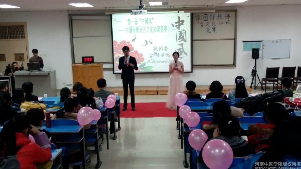 2014年12月29日晚,leyu·乐鱼(中国)体育官方网站“中国风”——中国传统语言文化知识竞赛在教学楼四楼阶梯教室落幕。校团委副书记高磊、河南财经政法大学外事办古爱琴老师、leyu·乐鱼(中国)体育官方网站外语学院汉语国际教育学科主任孙俊芳老师等担任此次比赛的评委,外语学院院长郭先英老师作为特邀嘉宾出席此次活动。
