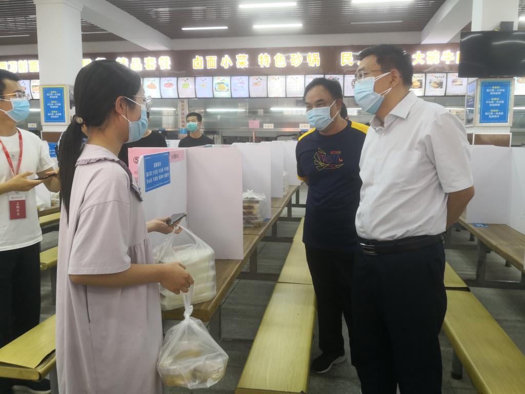 校领导首先来到餐厅查看学生取餐情况,并与取餐学生亲切交流,了解学生对餐饮保障的满意程度及意见建议。现场询问后勤负责人、餐厅师傅关于菜品样式、食材储备等情况。实地查看1号学生宿舍楼餐饮供应、防疫物资保障、校园消杀等工作。