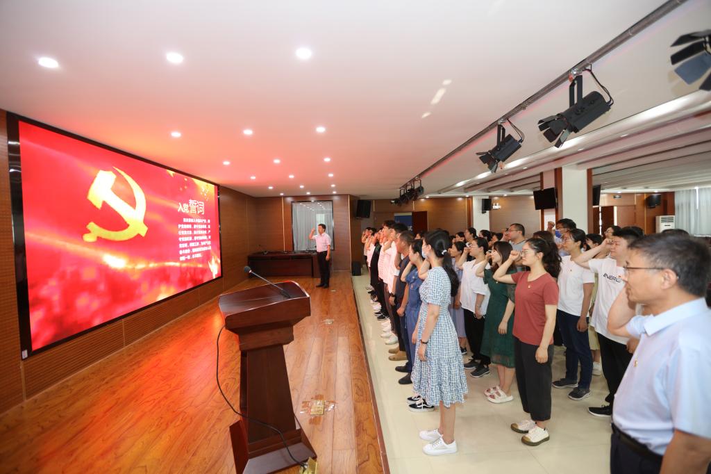 院纪委书记王倩宣读49名新发展职工党员和学生党员代表名单。院党委副书记王北溟领誓,新党员面向党旗,举起右手,庄严宣誓:“我志愿加入中国共产党……”在场的老党员一同重温入党誓词。