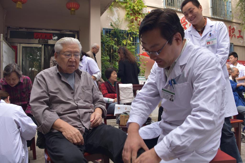 郭书敏副书记首先代表医院向离退休老干部、老教师致以节日的问候和诚挚的祝愿。离退休职工工作处党总支书记程伟华、处长艾国军对医疗服务队的到来表示欢迎,并对医院领导的关心、慰问表示衷心的感谢。活动现场,心血管科主任周立华对前来问诊的老人们仔细把脉问诊;针灸科主任李瑞国和其他推拿科专家为需要诊疗的老人们进行现场针灸推拿治疗;医疗队其他成员为前来就诊的老人们测量血压,提供医疗保健建议;春生元大药房的工作人员为老人们测血糖,还发放了精心准备的节日慰问品。