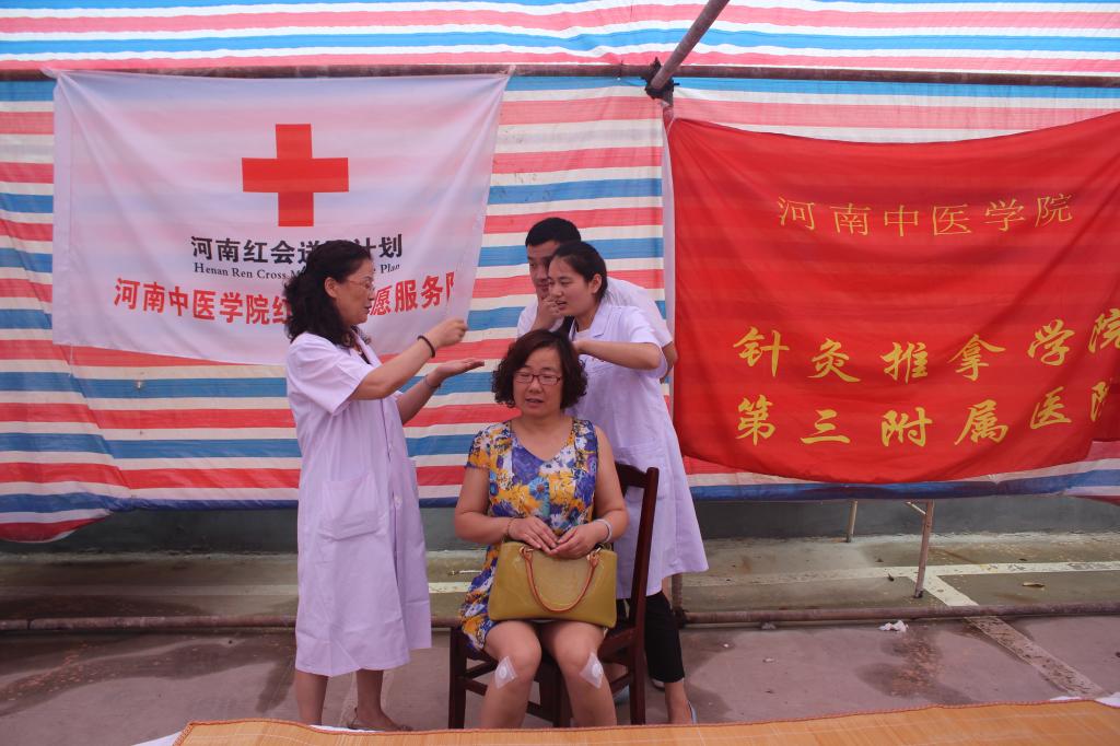 2015年7月15日,头伏第三天,同时也是针灸推拿学院“三下乡·红十字”志愿服务队到鲁山中医院进行免费医疗服务的第三天。校工会、校团委高度重视此次活动,积极部署,多方沟通,使义诊工作得以顺利开展。受校工会领导委托,针灸推拿学院、第三附属医院工会主席陶洁带领本院针灸学专家高希言教授和邵素菊教授冒着大雨来到鲁山,亲切慰问并鼓励同学们努力学习提高专业技术,扎实做好义诊服务工作。高希言教授和邵素菊教授不顾长途跋涉,天气恶劣,没顾上休息就立即投入紧张的工作。义诊过程中,就一些典型病例给同学们以及鲁山县中医院职工现场讲解、演示并时而进行问答,帮助大家加深印象,更好地掌握专业技能。