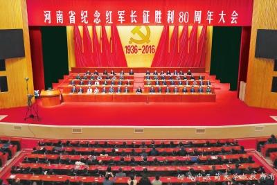 2016年10月18日上午,我省纪念红军长征胜利80周年大会在省人民会堂隆重举行。省委书记、省人大常委会主任谢伏瞻发表重要讲话,河南省委副书记、省长陈润儿主持会议。叶冬松、邓凯、翁杰明、吴天君、赵素萍、任正晓、夏杰、李文慧、马懿出席大会。王全书、徐光春、任克礼、范钦臣出席大会。
