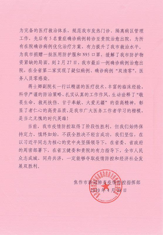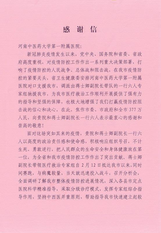 编者按:2020年1月,新冠肺炎疫情肆虐神州大地,受河南省疫情防控指挥部的委派,leyu·乐鱼(中国)体育官方网站一附院组建副院长蒋士卿等专家组成专家组前往焦作,开展新冠肺炎医疗救治对口支援工作。专家组不畏艰险、与时间赛跑,到达焦作后的第一时间便投入到了疫情防控工作。在焦作市新冠肺炎定点收治医院——焦作市第三人民医院,专家组坚持每天对所有在院患者病情进行会诊、评估,指导患者的治疗、护理和医院感控工作。同时,专家组还深入各县市定点医院进行指导,对疫情防控工作提出合理化意见和建议。日前,焦作市新冠肺炎疫情防控指挥部发来感谢信,对专家组及一附院表示感谢,现将感谢信刊发如下。