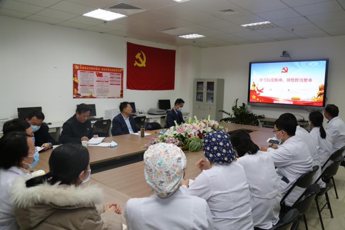 调研结束后,别荣海到所联系的心内一区党支部与全体党员共同参加了“弘扬抗疫精神、践行责任担当”主题党日活动。会上,别荣海与全体党员观看了学习视频,并与支部书记杜廷海、支部党员王永霞、胡宇才等同志围绕“疫情下共产党员的使命担当”的问题进行了深入的交流。向支部党员同志在疫情防控中的辛劳付出表示敬意,表达问候,并就下一步工作提出要求。别荣海还与入党积极分子张岱进行了谈心谈话。