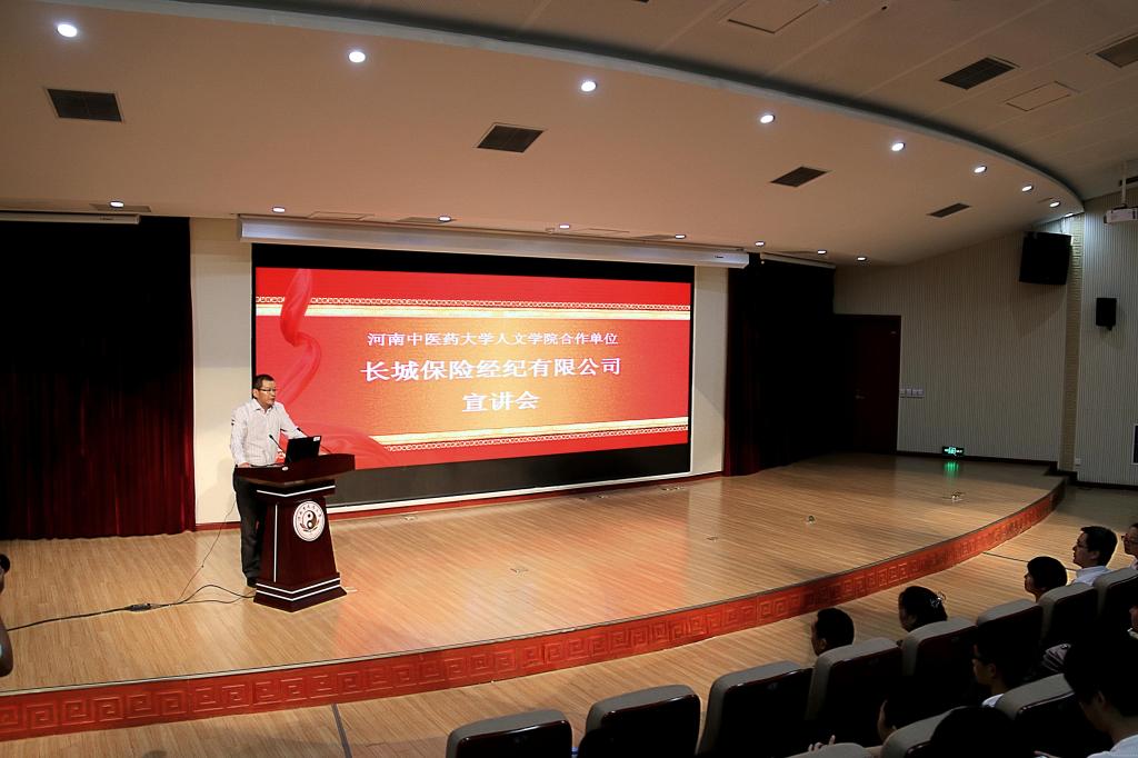 揭牌仪式前,长城保险经纪有限公司宣讲会在图书馆第一报告厅举行,宣讲会由人文学院党委书记王剑锋主持。人文学院领导班子全体成员、全体辅导员及公共事业管理、文化产业管理等相关专业的350余名学生参加了会议。