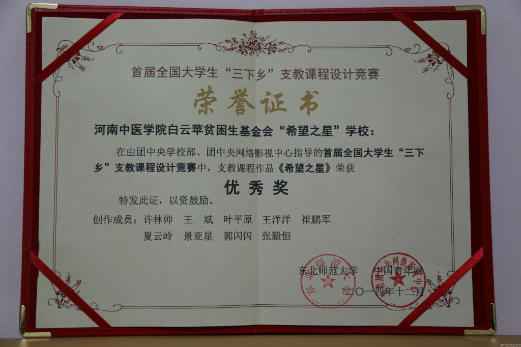 在团中央学校部和团中央网络影视中心的指导下,中国青年网于2014年暑期组织开展首届全国大学生“三下乡”支教课程设计竞赛活动。此次比赛以“爱心传递知识,创意成就梦想!”为主题,由东北师范大学承办,全国共有271个支教团队的536个作品参与比赛。自2011年起,为关心关注留守儿童,白云苹贫困生基金会成立了由一批优秀志愿者组成的“白云苹贫困生基金会希望之星学校”,定期到郑州周边的农民工子弟学校对小学生进行辅导;每年暑期还依托学校大学生“三下乡”服务团,为社会实践服务地的中小学生进行义务支教,深受好评。此次参赛作品,是根据2014年基金会在汝州市大庙村开展的支教活动的课程安排、教学过程、社会评价为题材,把中医学传统知识与乡村留守儿童素质教育相结合,经过评委综合课程作品的创意、可操作性、可推广性等多个方面,最终入围全国前60名,在中青网展示,并荣获“首届全国大学生‘三下乡’支教课程设计竞赛优秀奖”。