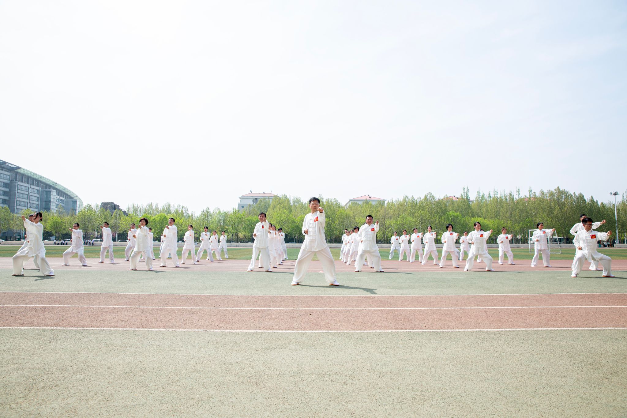正午时分,春风和煦,阳光明媚,来自26个基层工会近500位教职工组成的15支代表队提前来到指定场地,积极投入赛前准备,并按抽签顺序依次上场表演。各代表队参赛人员精神饱满,服装整齐,动作标准、刚柔并济、呼吸顺畅、意念集中;比赛方阵整齐划一、气势恢宏,完美诠释了八段锦“意动行随、神形兼备、松紧结合、动静相兼”的功法和内涵。